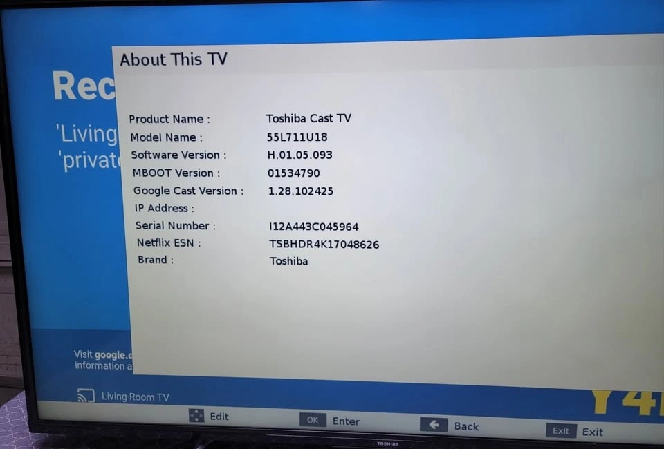 Great condition Toshiba 55" 4K UHD HDR LED TV with Chromecast Built-in. It's about 3-4 years old and works perfectly. Includes remote control, model number Toshiba 55L711U18. Features 3 HDMI inputs. You'll need your own Google account to use the smart features. I can demo it for you before you take it. Please only contact me if you are ready to pick it up. This TV offers stunning 4K visuals with HDR, a 60Hz refresh rate, and DTS Studio Sound. Built-in Wi-Fi and an Ethernet port allow for easy streaming and network connection. It also has wireless casting capabilities. Keywords: Led,Smart,Tv,Samsung,Sony,Panasonic,Hisense,Vizio,Phillips,3D,Apple,IPhone,IPad,Oled. PLASMA, LCD, LED, 3D, SMART, 4K, UHD, Curve tv, TV Stands, Wall Mount.