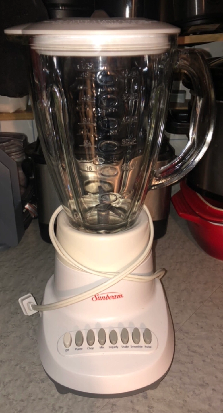 Glass jar blender with multiple functions. Includes pulse, puree, chop, mix, liquefy, shake, and smoothie settings. Off switch included. White base, grey bottom. Good used condition.