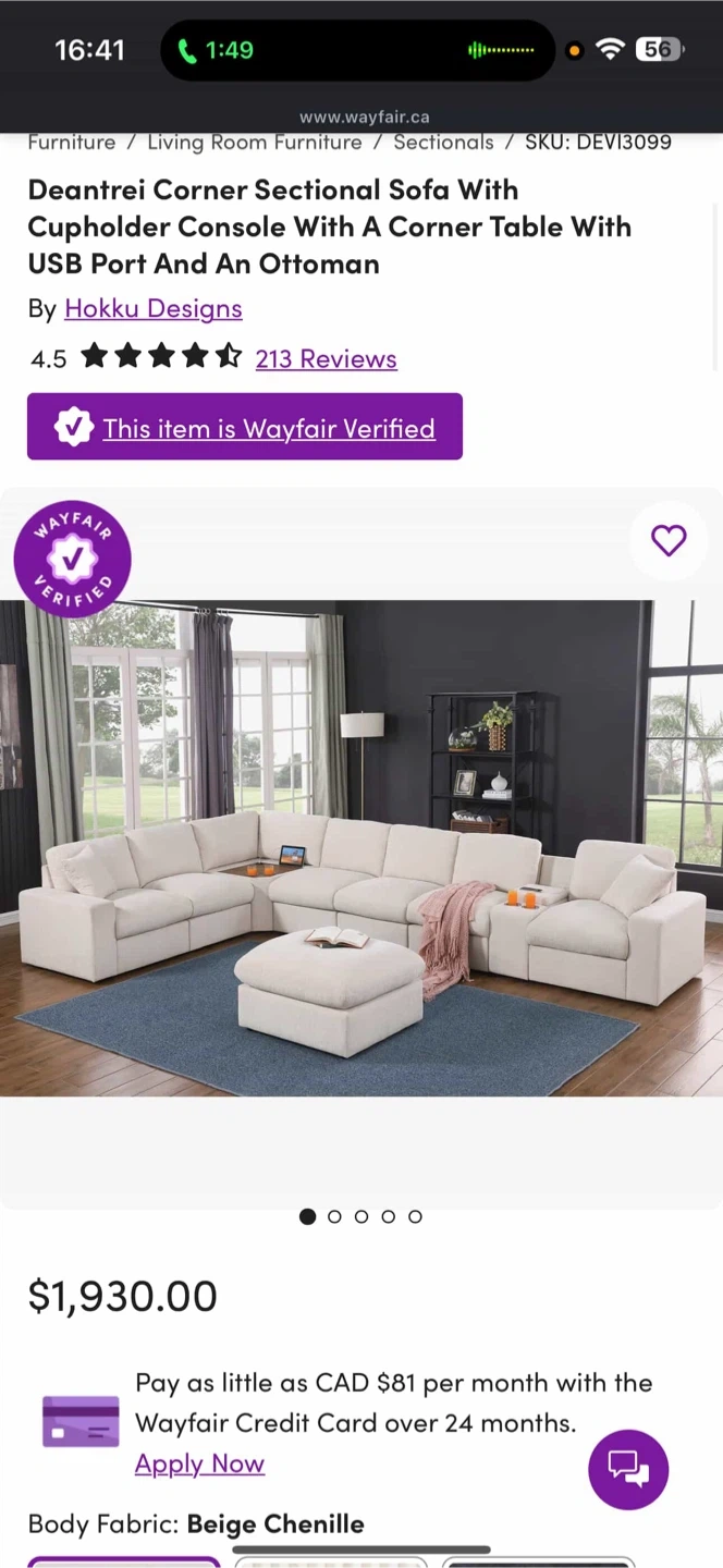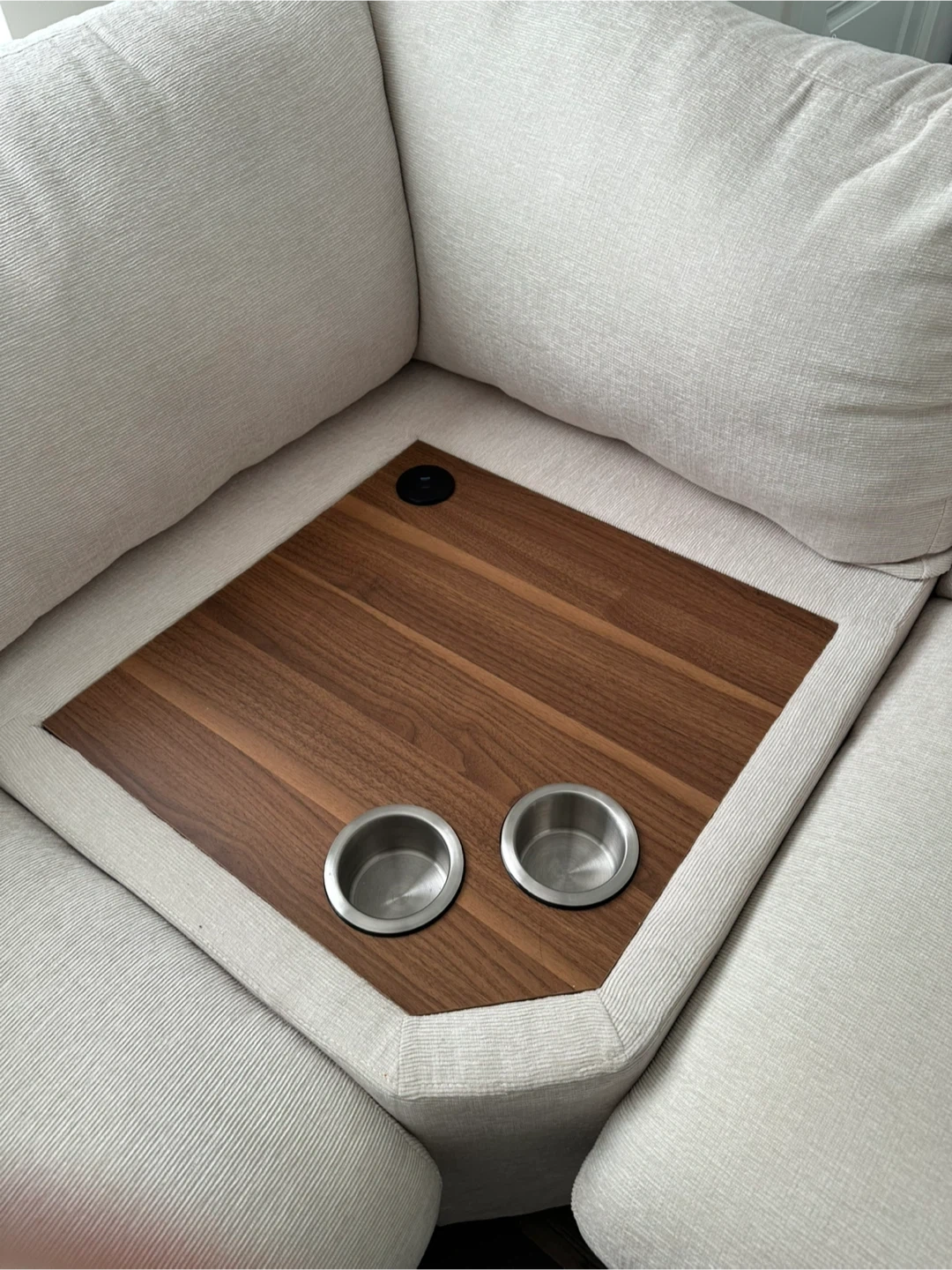This large sectional sofa offers comfortable seating and a convenient built-in wooden console with cup holders and USB charging ports. It's perfect for relaxing and keeping devices powered up. The neutral fabric complements most decor. Almost new we bought it last year October.