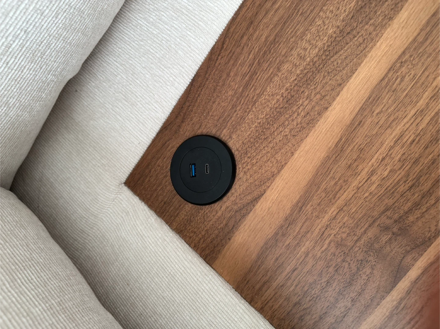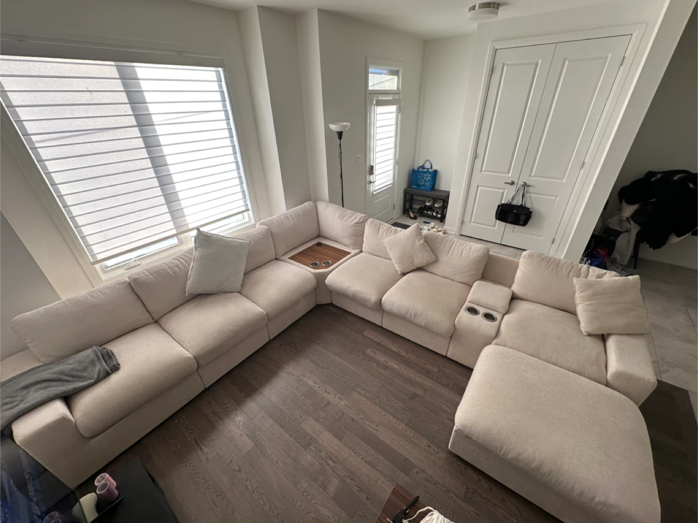 This large sectional sofa offers comfortable seating and a convenient built-in wooden console with cup holders and USB charging ports. It's perfect for relaxing and keeping devices powered up. The neutral fabric complements most decor. Almost new we bought it last year October.