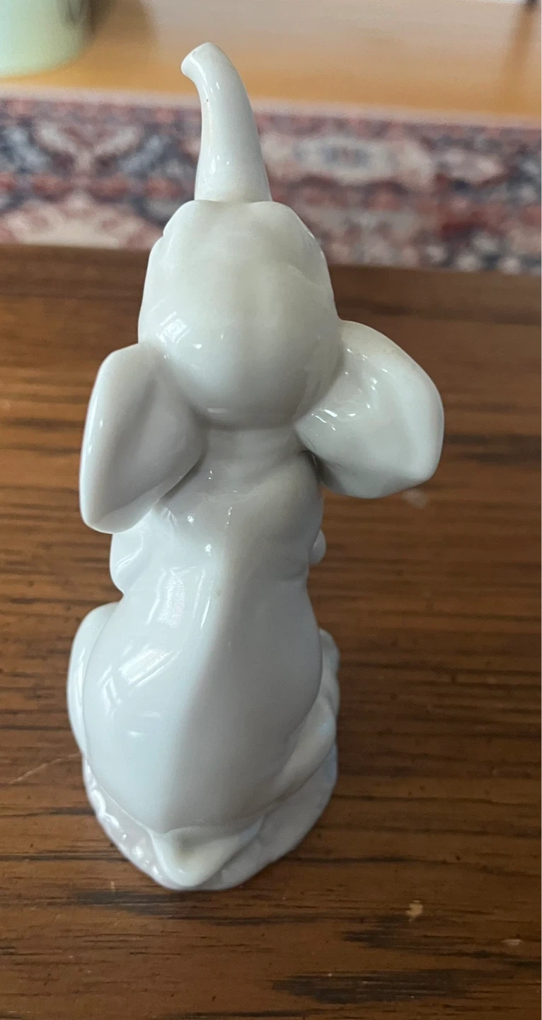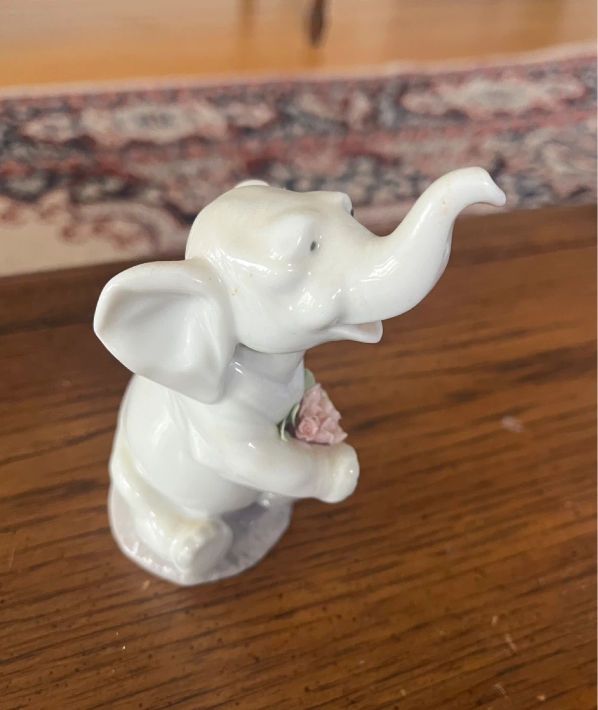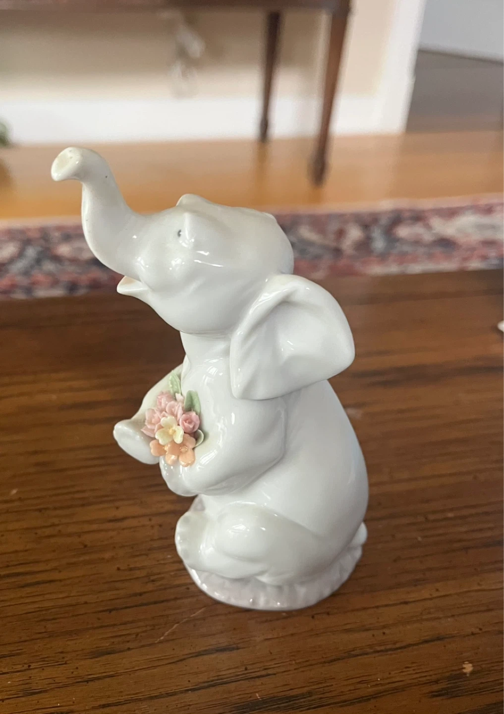 Vintage retired Lladro. Charming white elephant figurine holding a small bouquet of pastel-coloured flowers.