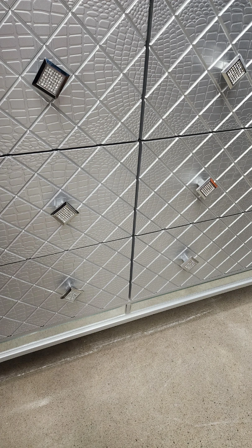 This mirrored dresser features a textured silver finish on its six drawer fronts and a mirrored frame. It's a stylish addition to any bedroom for storing clothes and accessories. Silver hardware complements the diamond-patterned drawers.