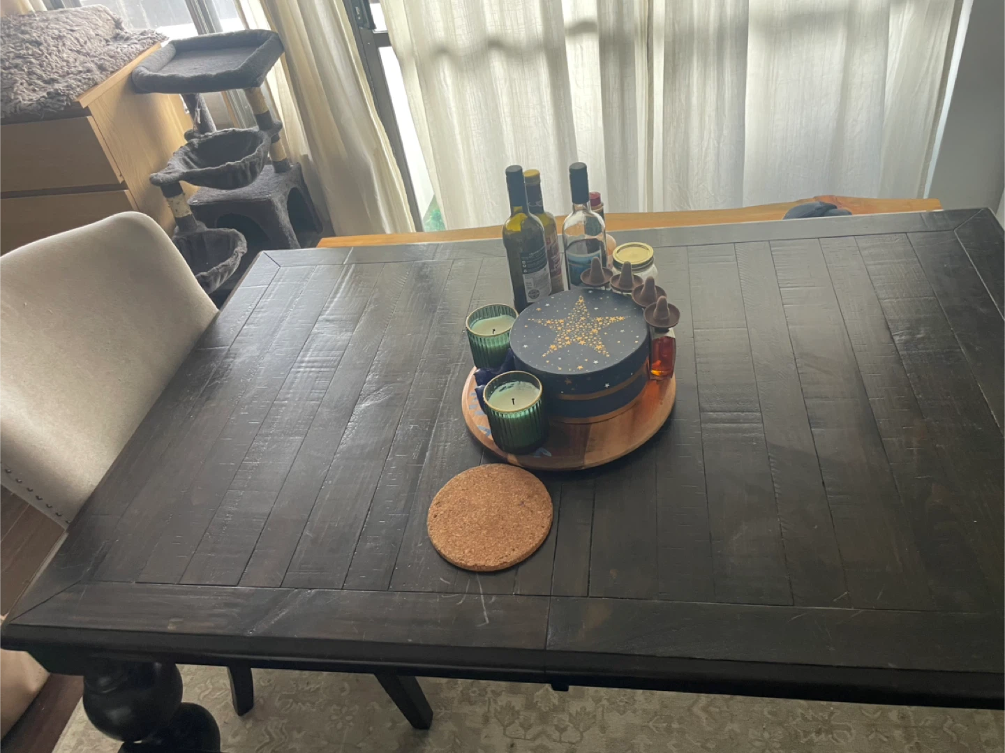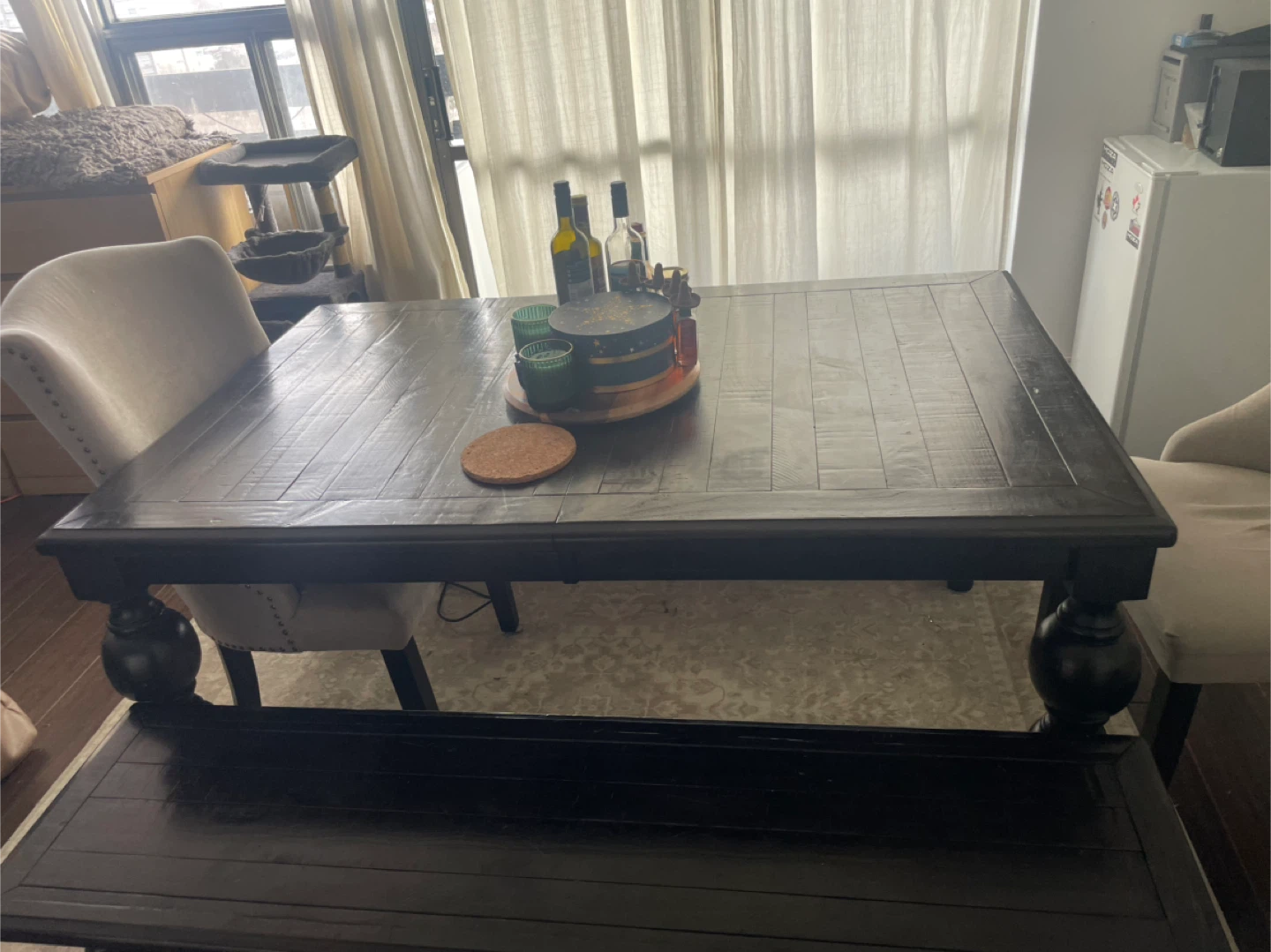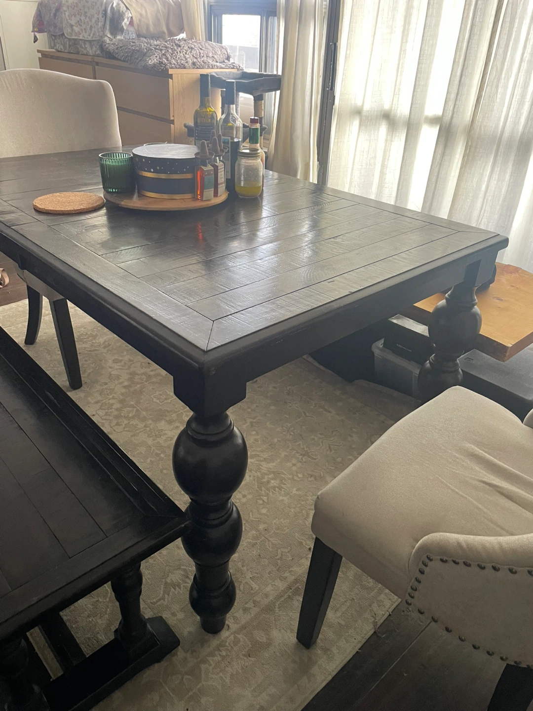 Selling a solid pine dark wood dining table, perfect for family dinners or gatherings! It comes with a matching bench, offering extra seating. The table has a classic design with sturdy, turned legs. It's in great condition and ready to be the centrepiece of your dining room