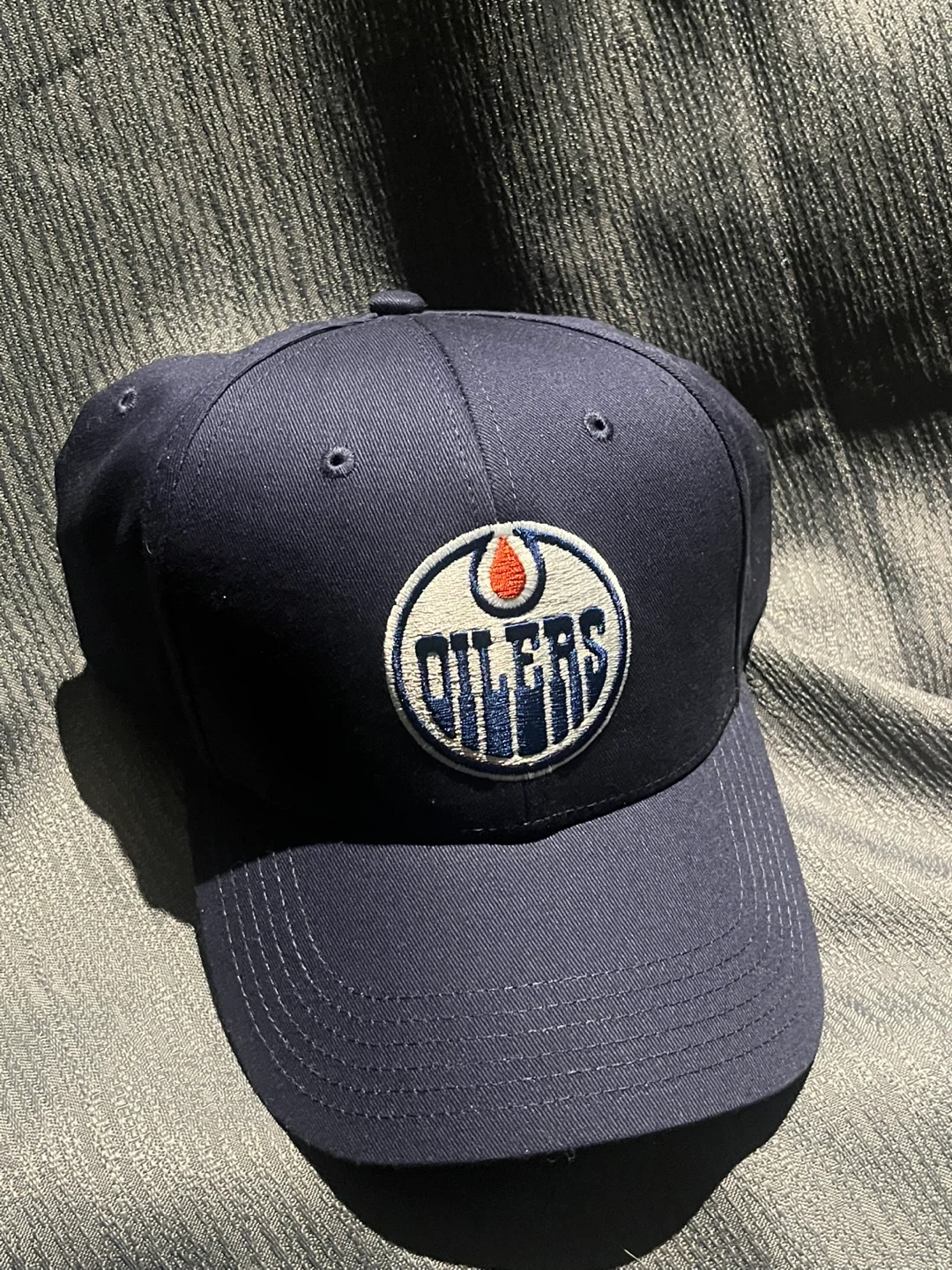 Navy blue Edmonton Oilers baseball cap with official NHL tag. Features embroidered Oilers logo on the front and an adjustable strap for a comfortable fit.