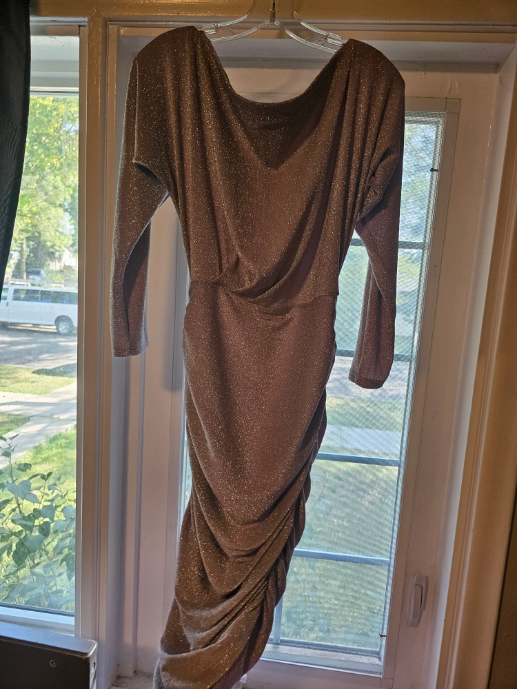 Selling a lovely silver dress with a subtle sparkle. It's perfect for an evening out or a special occasion. The material is soft and drapes nicely. It's in great condition and ready for a new home