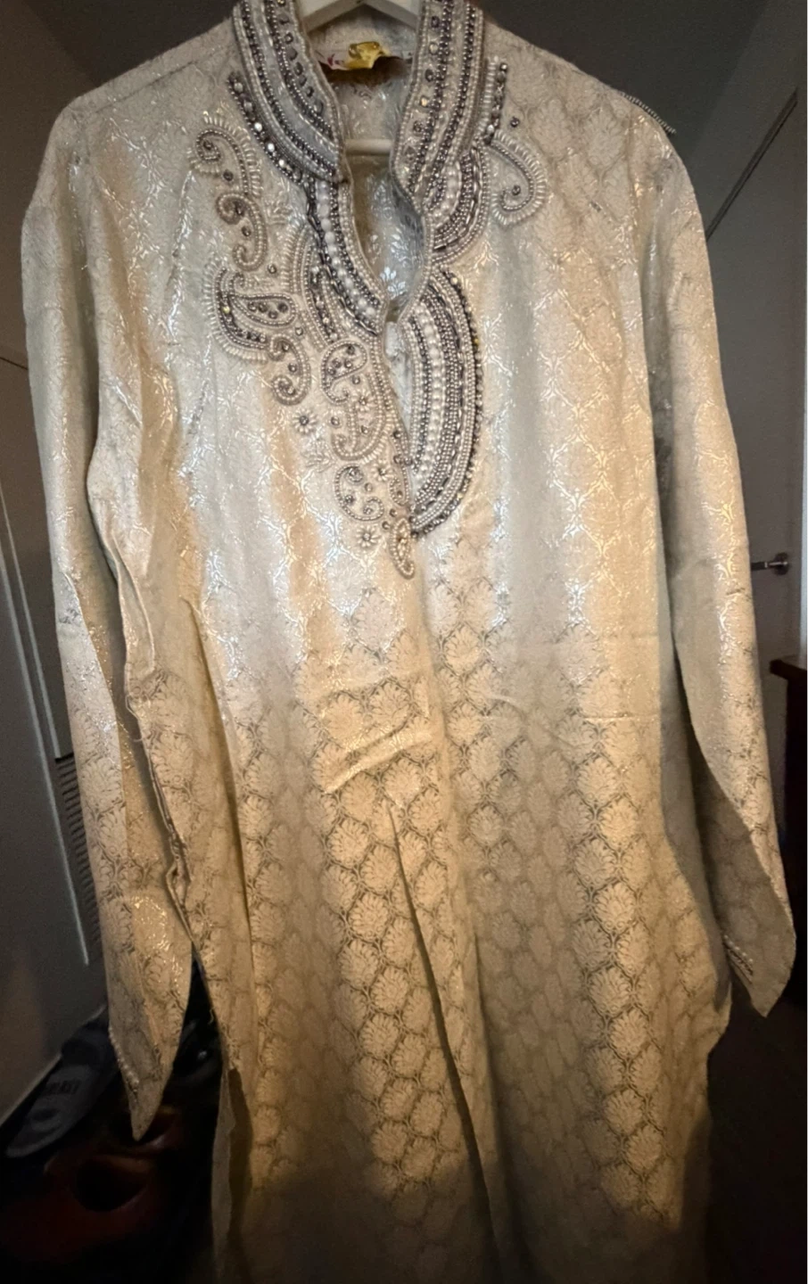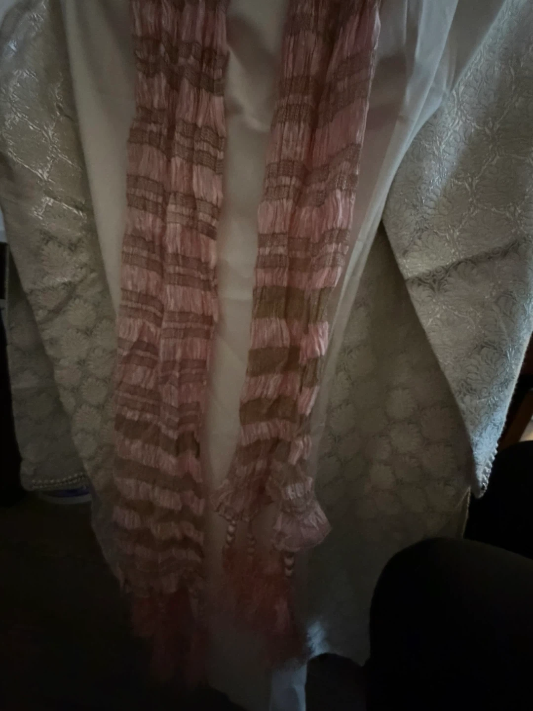 Cream coloured kurta with intricate silver beadwork on the neckline and cuffs. Includes a matching pink and brown crinkled scarf with tassels. Fabric appears to be a silk blend with a subtle brocade pattern.