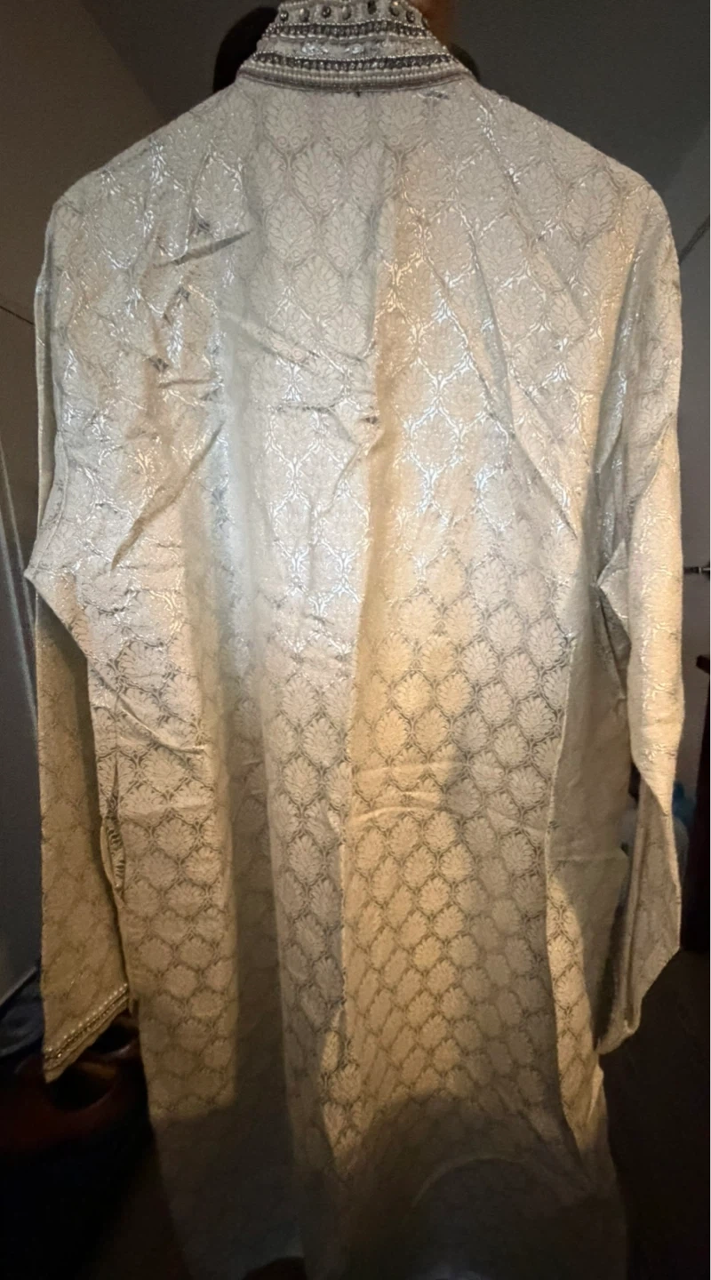 Cream coloured kurta with intricate silver beadwork on the neckline and cuffs. Includes a matching pink and brown crinkled scarf with tassels. Fabric appears to be a silk blend with a subtle brocade pattern.
