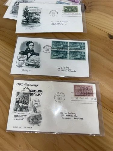 Lot of 10 US stamps First Day Covers (#1017, 18, 19, 20, 21, 23, 24, 25, 25, 1027) featuring 3c stamps from 1953. See all pictures of item. Sold as is.