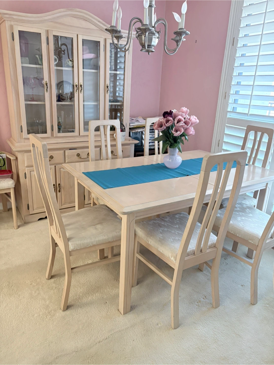 This dining room set includes a hutch with glass doors and a large dining table with seven chairs and two leaves . The chairs are upholstered with a light-coloured fabric. The wood finish is a pale, creamy tone. It's perfect for a family meal!