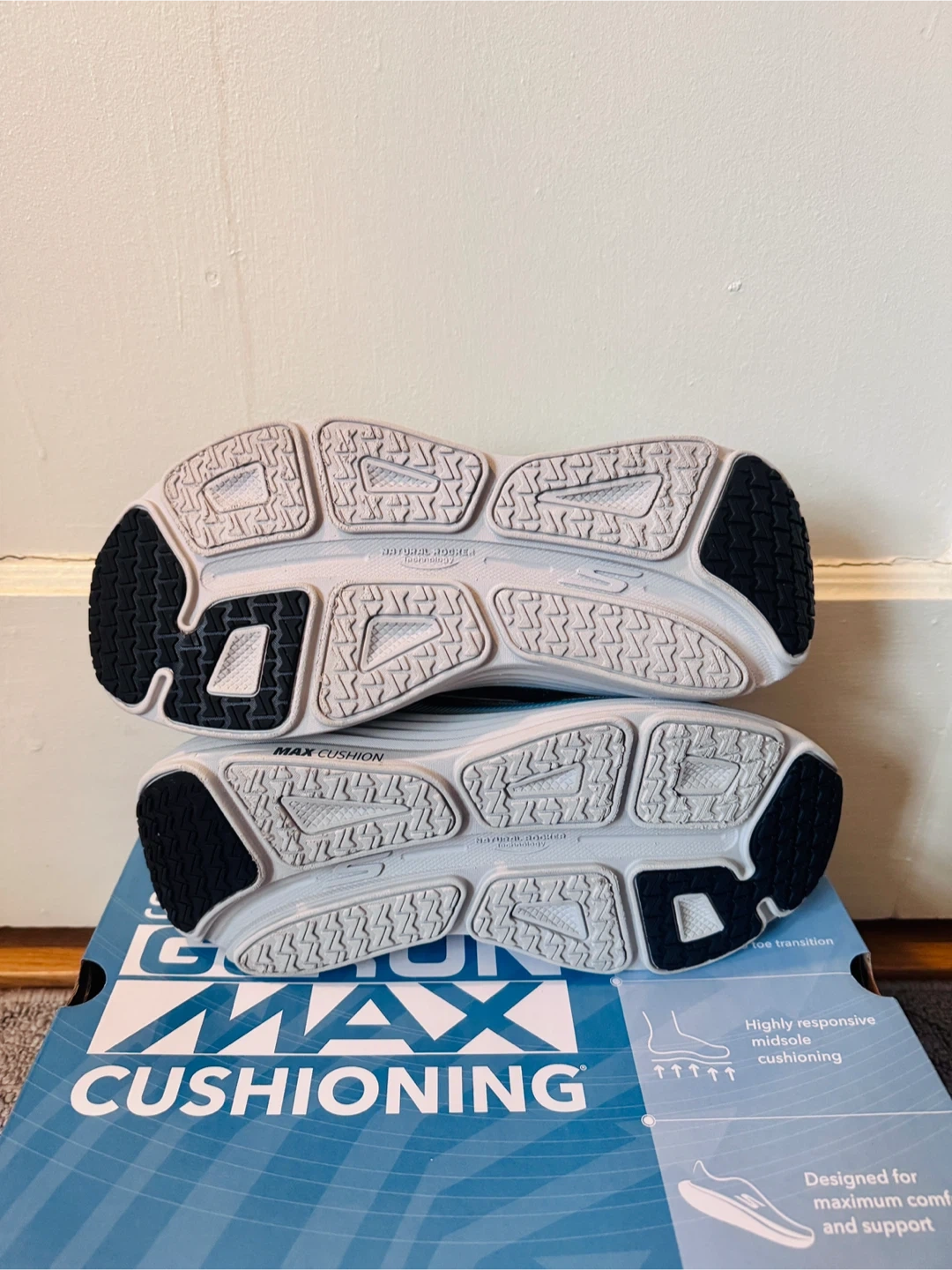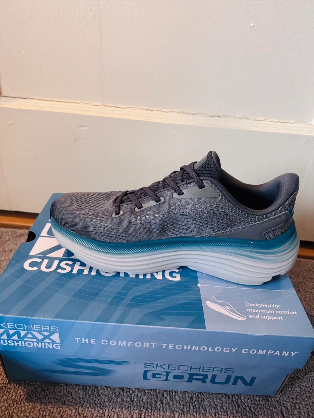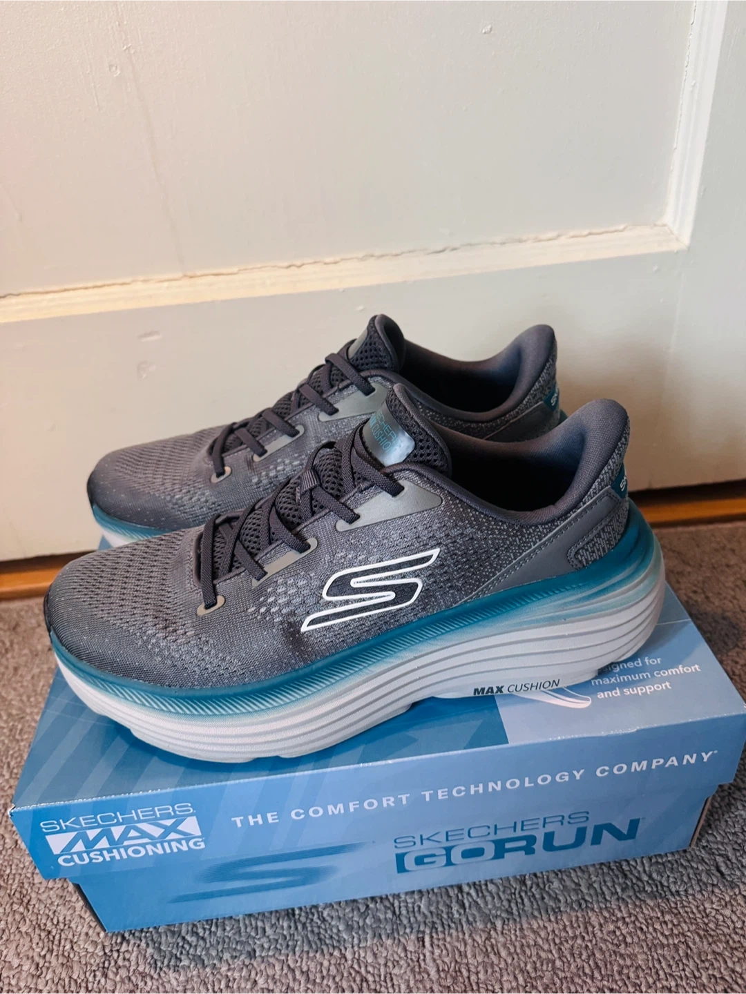 Skechers GOrun Max Cushioning running shoes in gray with blue accents. These shoes feature a breathable mesh upper and responsive cushioning for maximum comfort and support with Slip-Ins. Designed for a smooth heel-to-toe transition. Includes original box.