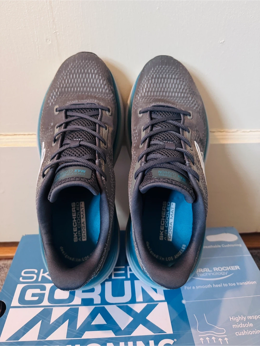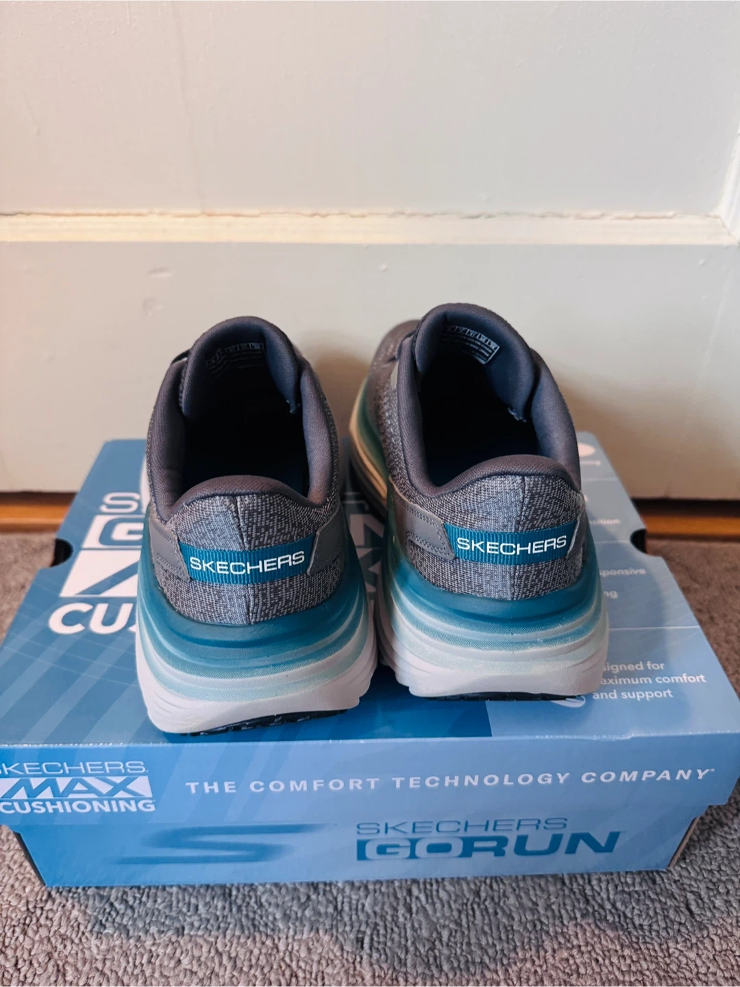 Skechers GOrun Max Cushioning running shoes in gray with blue accents. These shoes feature a breathable mesh upper and responsive cushioning for maximum comfort and support with Slip-Ins. Designed for a smooth heel-to-toe transition. Includes original box.