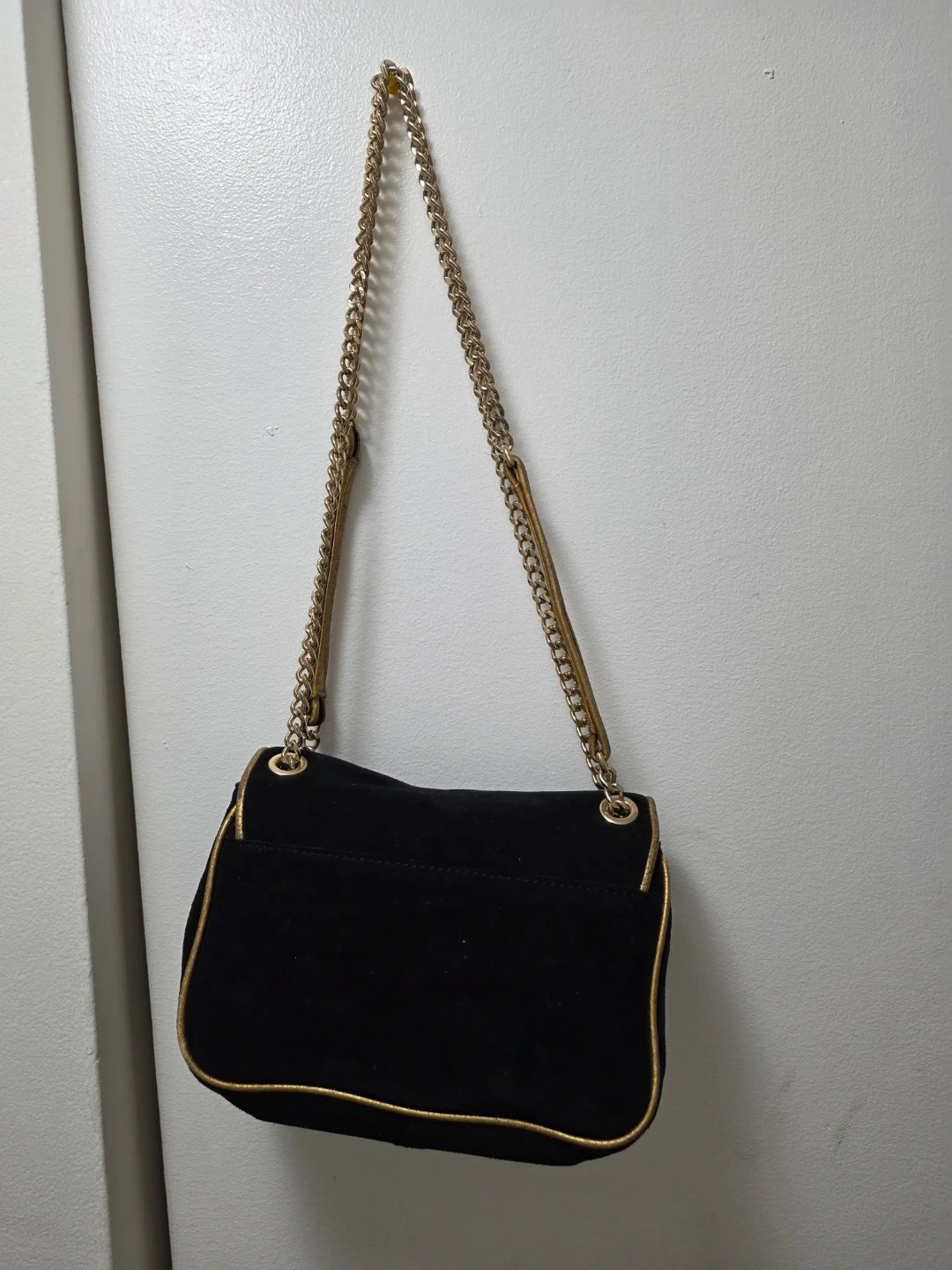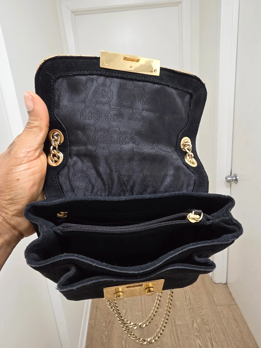 This authentic rare find Michael Kors shoulder bag is made of black suede with gold hardware. It features a turn-lock closure and a decorative chain strap. The interior is lined with branded fabric and has a zippered compartment.