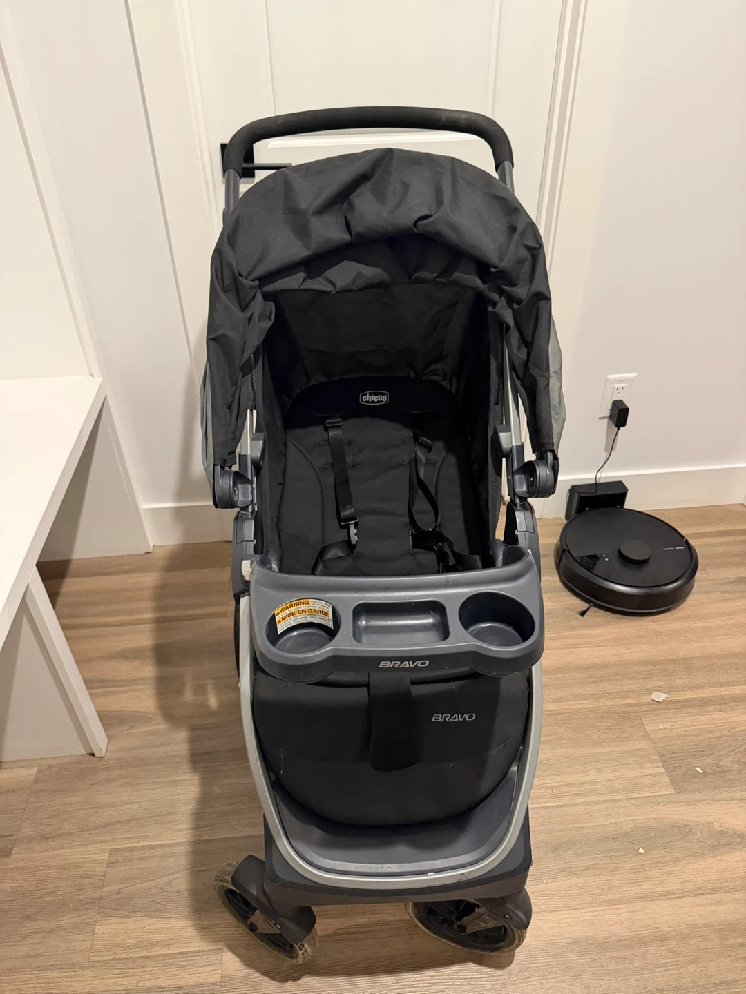 This Chicco KeyFit 30 infant car seat clicks into the Bravo stroller for a convenient travel system. The car seat is black with grey and orange accents. The stroller is also black and grey.