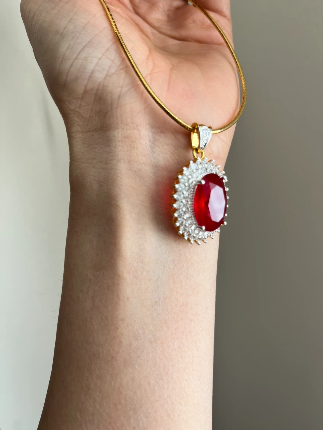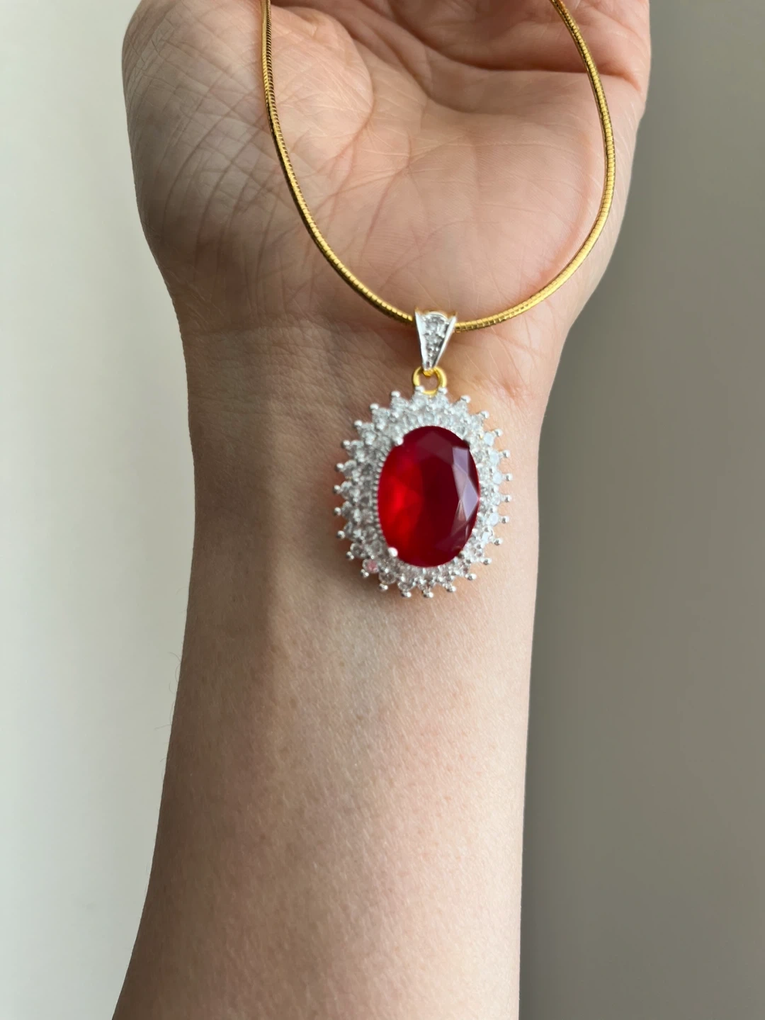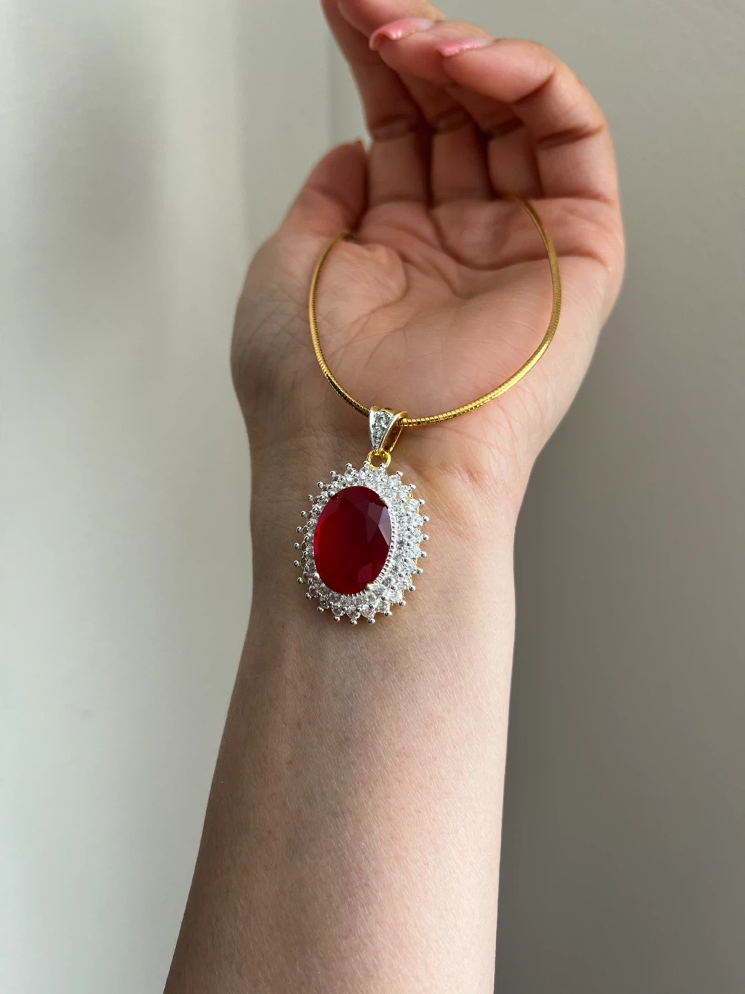 This necklace features a thin gold chain and a pendant with a large, oval-cut red gemstone surrounded by small clear stones. The pendant setting appears to be gold-toned with silver accents. It's a lovely piece for adding a pop of colour to an outfit.