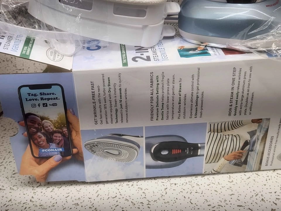 This Conair Turbo Extremesteam 2 in 1 Steamer and Iron is a versatile and efficient garment care tool. It heats up in just 10 seconds to quickly remove wrinkles. It has a 0.5 L capacity and 1875 W power for effective steaming, and includes a nozzle accessory for added convenience. The comfort handle and adjustable steam feature make it easy to use. Keep your clothes looking sharp and fresh! Our Price: $19.99 (MSRP: $59.99). Condition: Open Box. Pick up @ Discount Oceanside, 2929 Long Beach Rd, Oceanside NY 11572.