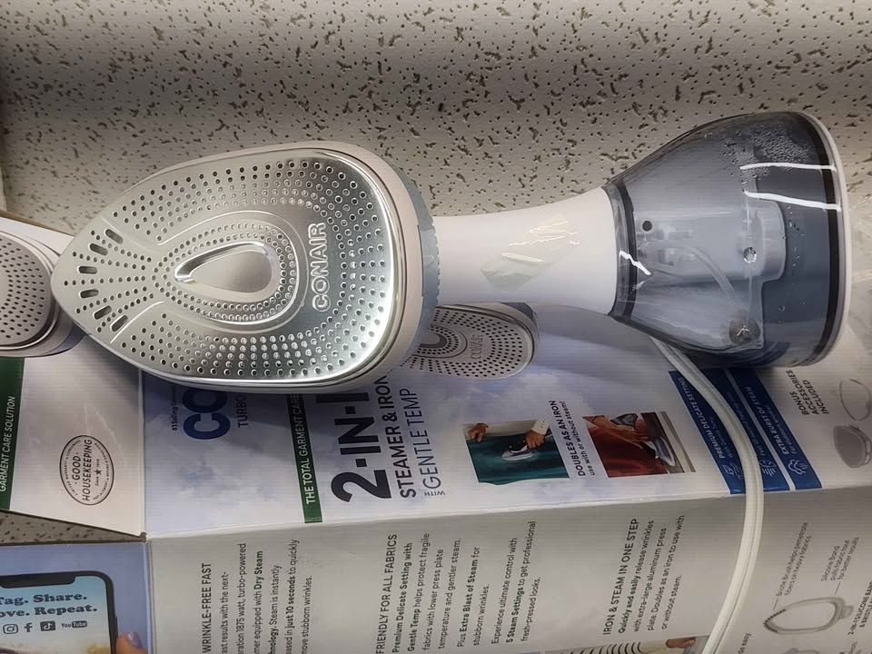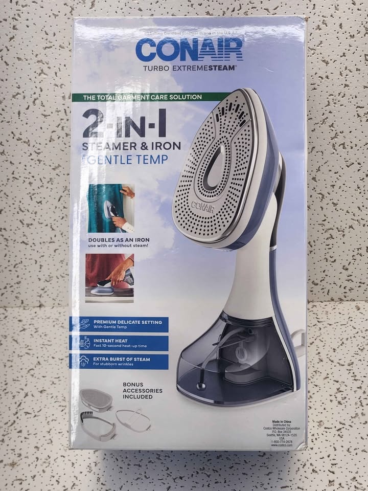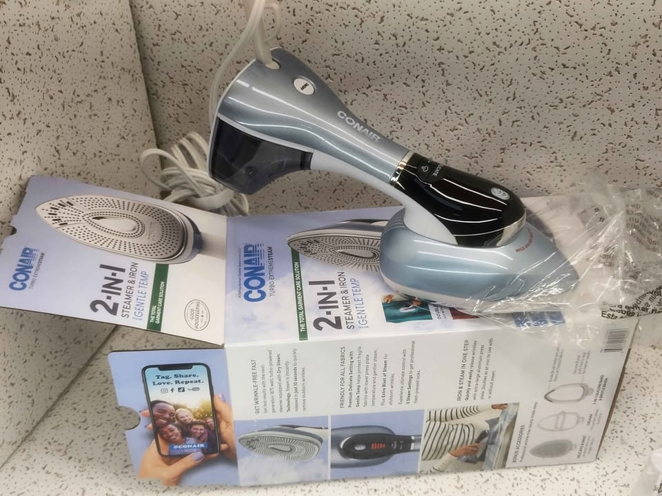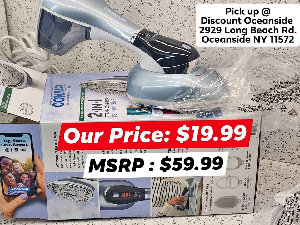 This Conair Turbo Extremesteam 2 in 1 Steamer and Iron is a versatile and efficient garment care tool. It heats up in just 10 seconds to quickly remove wrinkles. It has a 0.5 L capacity and 1875 W power for effective steaming, and includes a nozzle accessory for added convenience. The comfort handle and adjustable steam feature make it easy to use. Keep your clothes looking sharp and fresh! Our Price: $19.99 (MSRP: $59.99). Condition: Open Box. Pick up @ Discount Oceanside, 2929 Long Beach Rd, Oceanside NY 11572.