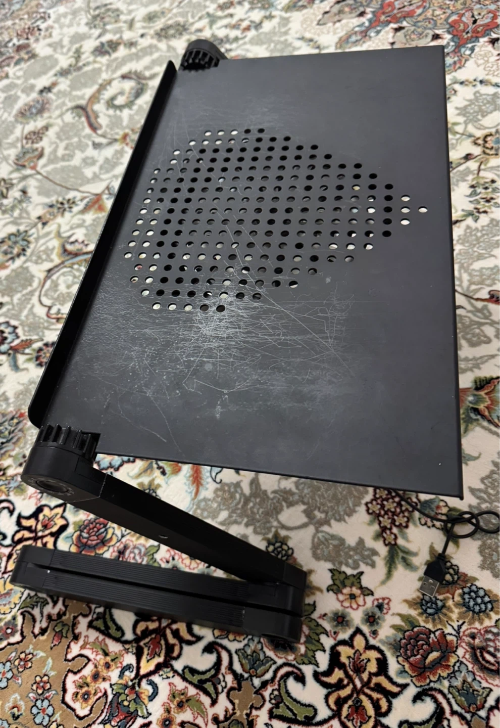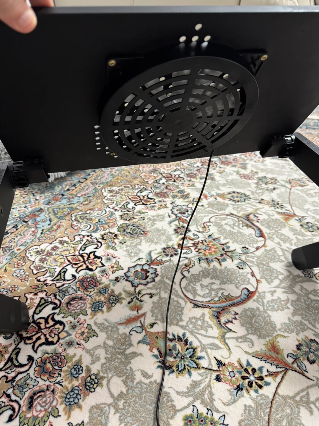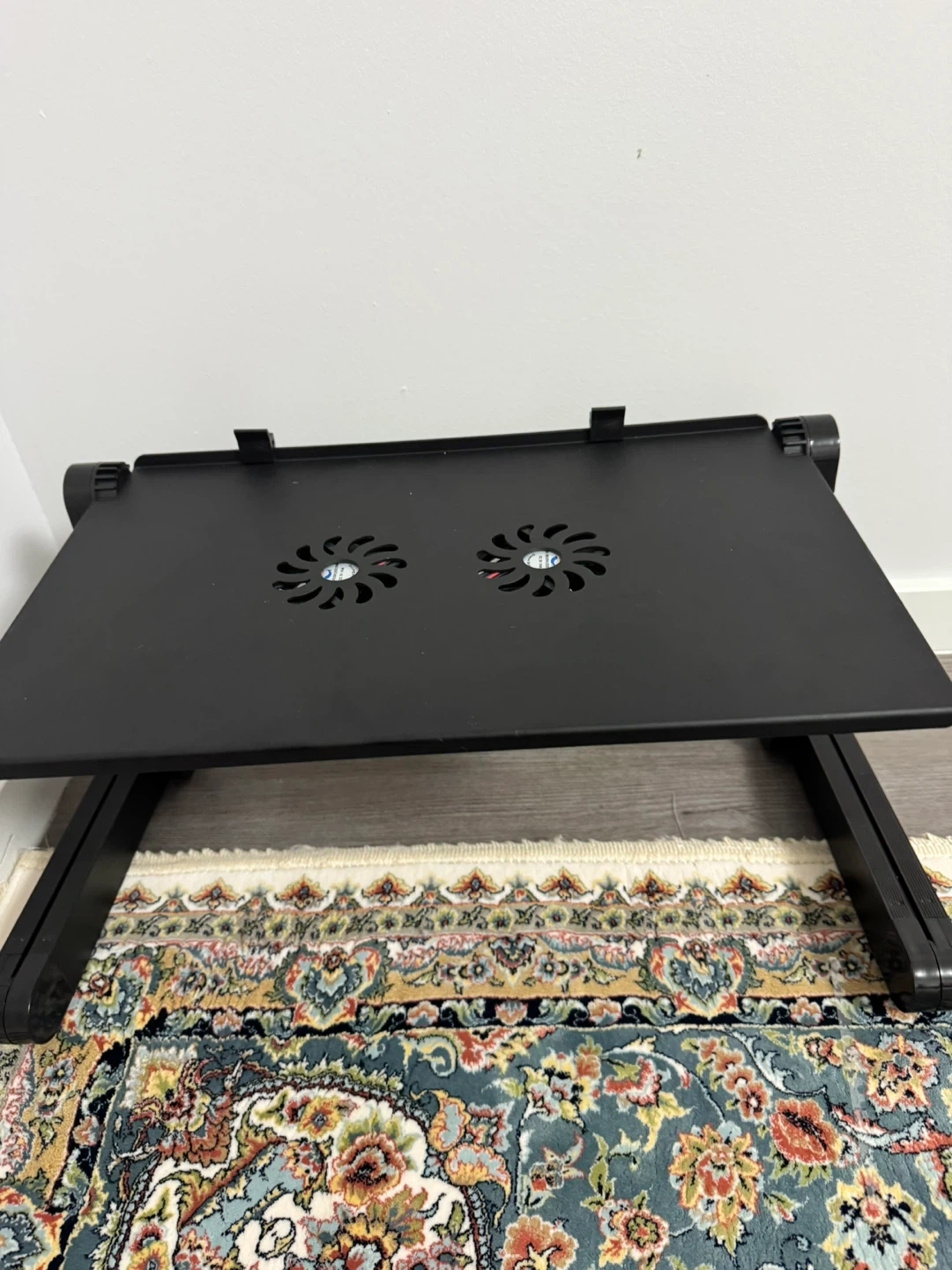 This adjustable black laptop stand features built-in cooling fans to help keep your device from overheating. It's designed with adjustable legs for optimal viewing angles and portability. The stand is made of durable metal.