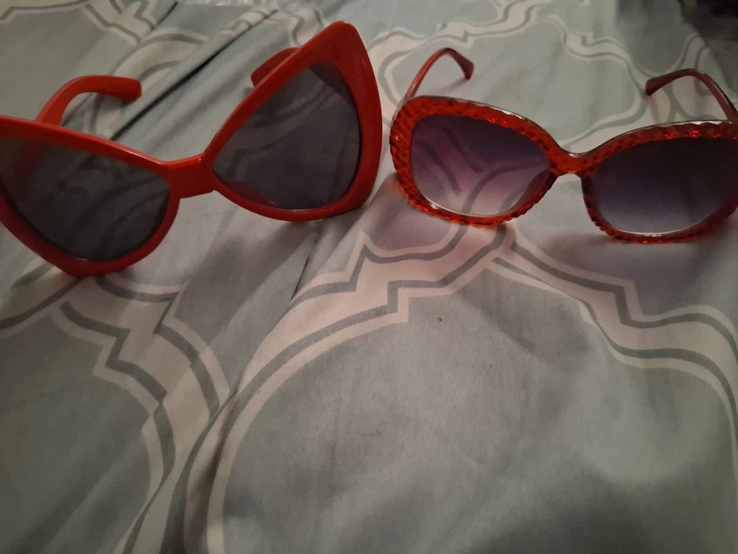 Two pairs of stylish red sunglasses are available. One pair features a cat-eye shape, while the other has a decorative textured frame. Both are designed for adult wear. $100 for both