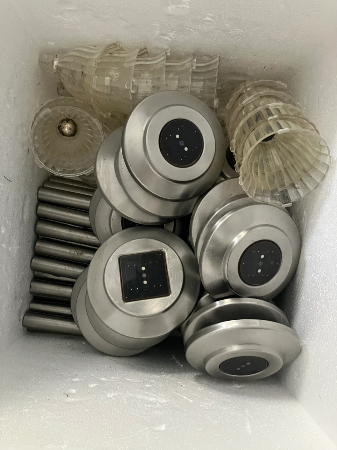 Here's a bundle of solar pathway lights. They're made of stainless steel with a silver finish. Each light has a solar panel on top to charge during the day. It's great for illuminating walkways or gardens at night!