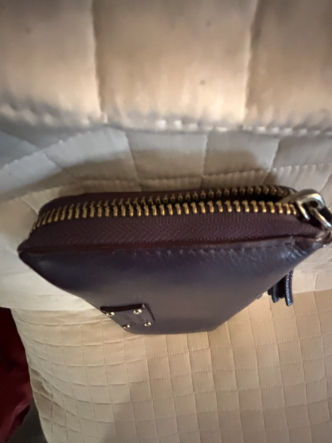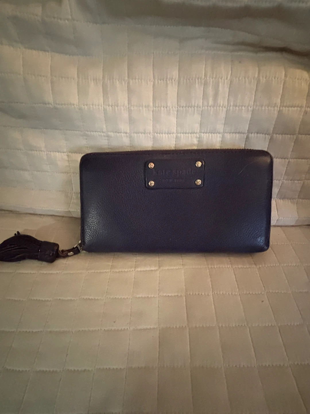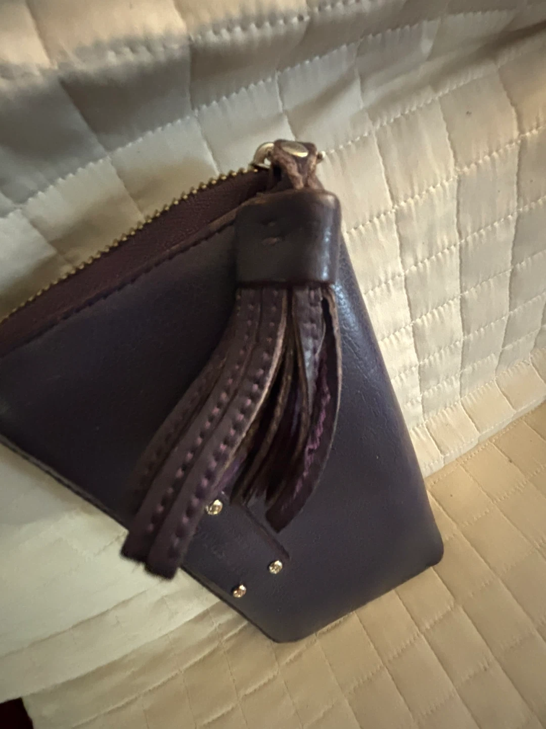 This Kate Spade zip-around leather wallet comes in a classic purple colour. It's made from textured leather and features a tassel detail on the zipper pull. Multiple card slots and compartments inside.