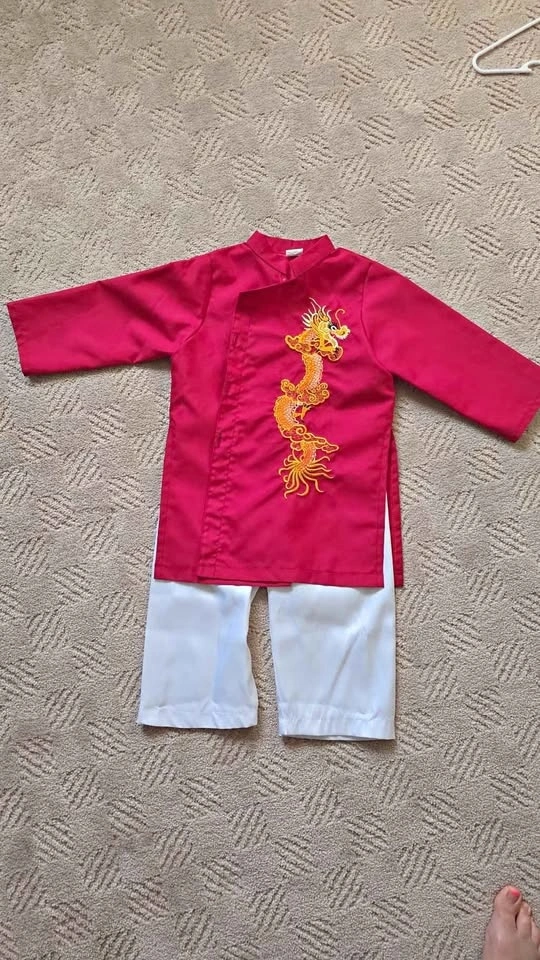 Incredibly cute red Ao Dai, perfect for Lunar New Year or Tet. Comes with white pants. In terrific condition with a detailed embroidered dragon on the chest. Made of very sturdy material that does not snag or rip. Perfect for photos and family celebrations. Pick up in Surrey from 148th Street and 69th Ave. Can meet in Burnaby near Brentwood area on certain days, please inquire to arrange.