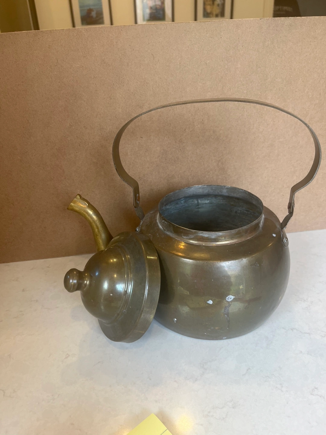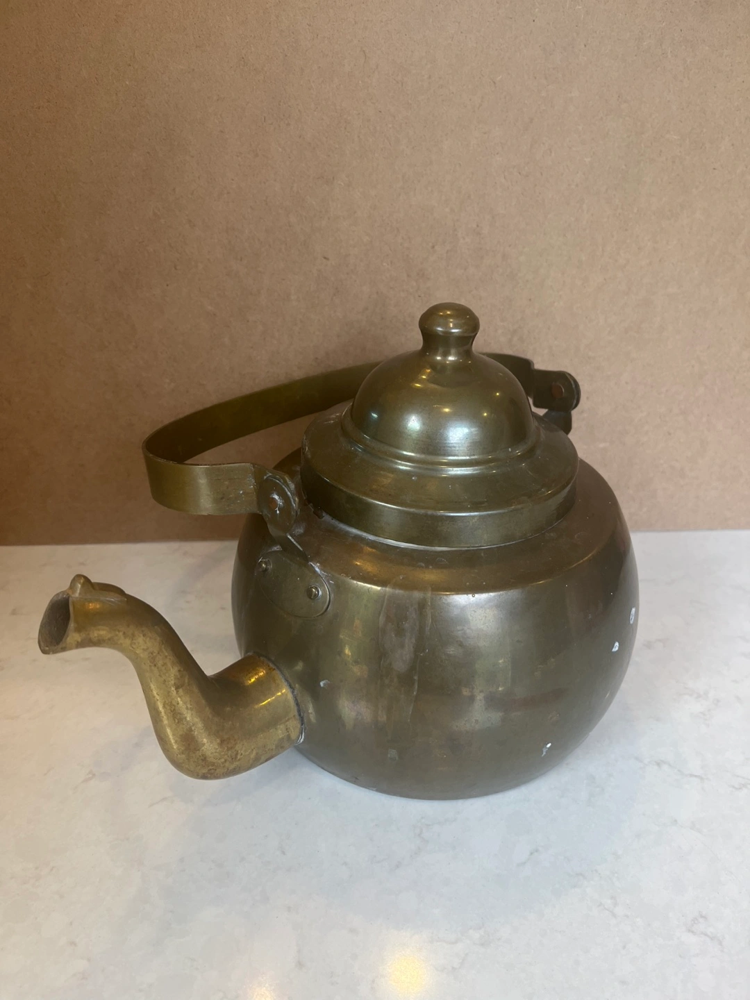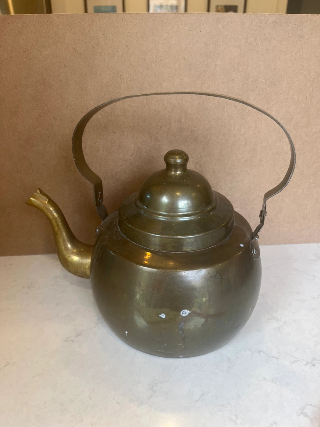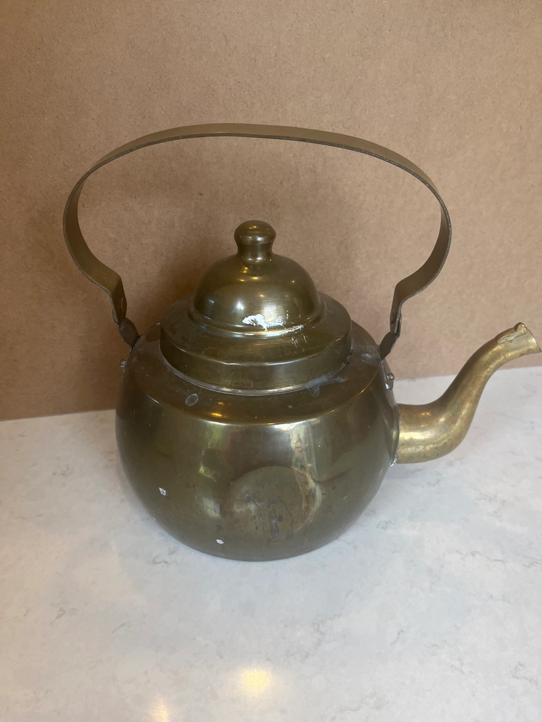 Old rustic solid brass handmade kettle. Completely usable with movable handle that bends each way. In fourth photo has a dent in the base and a little paint stain that can be easily removed. Overall has a few rough marks can be easily buffed and fixed!!
