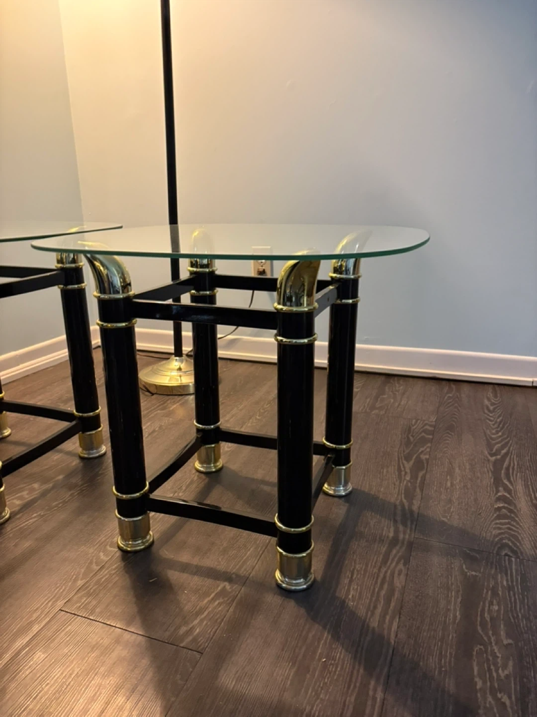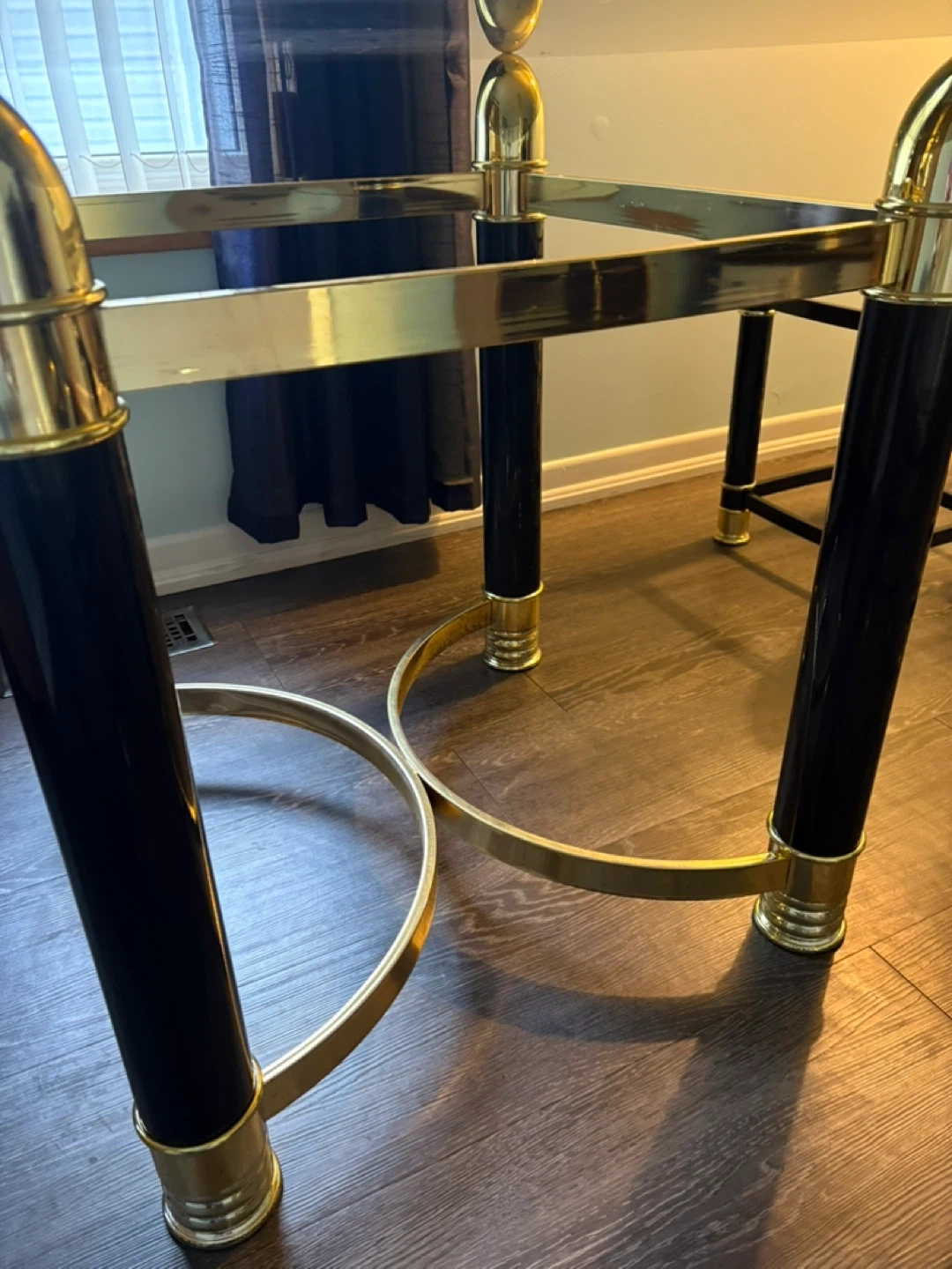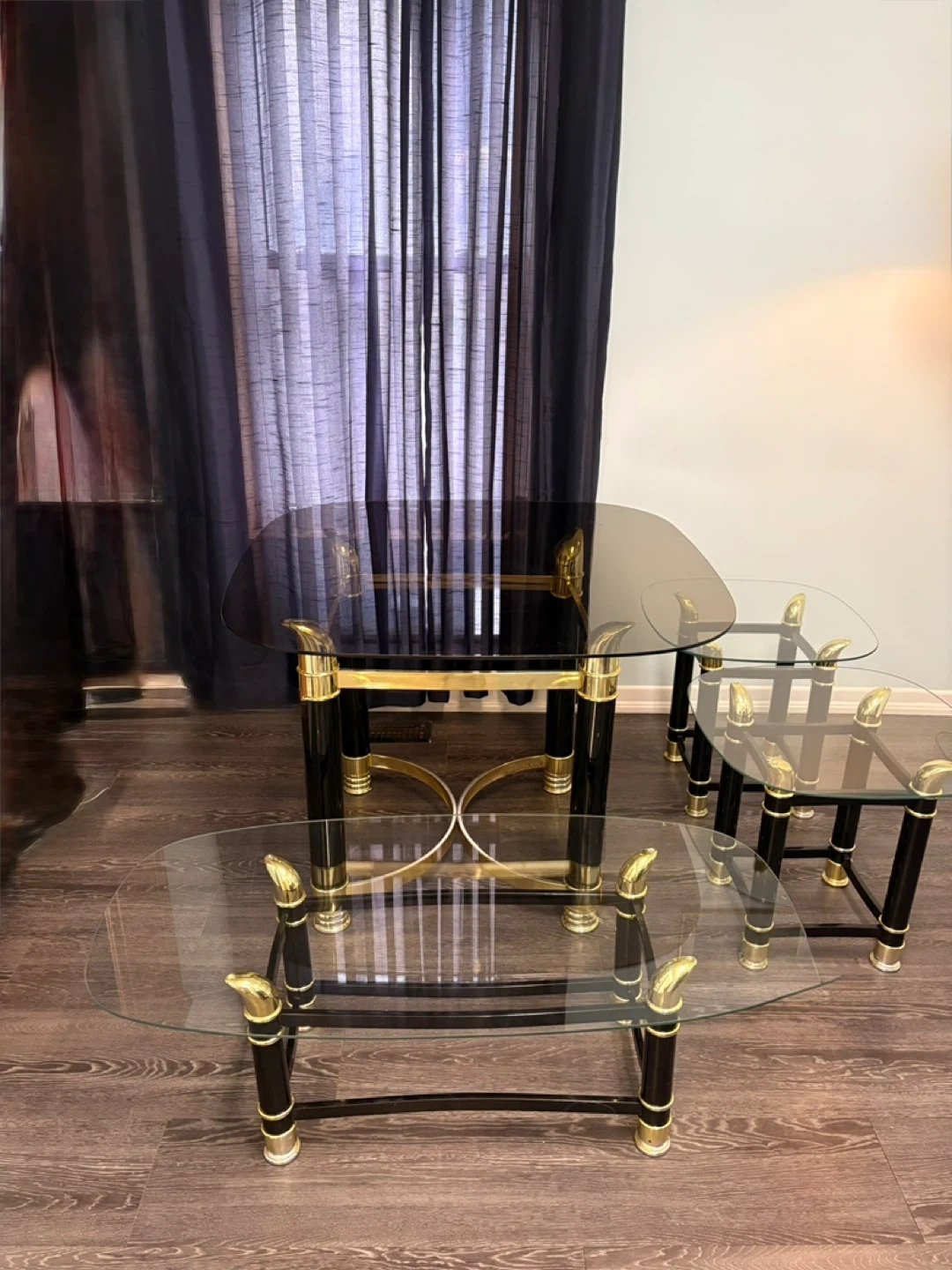 Selling a glass top kitchen or dining table; coffee table and two matching end tables. The tables have a black and gold finish, giving them a sleek and modern look. They're perfect for adding a touch of elegance to your living room!