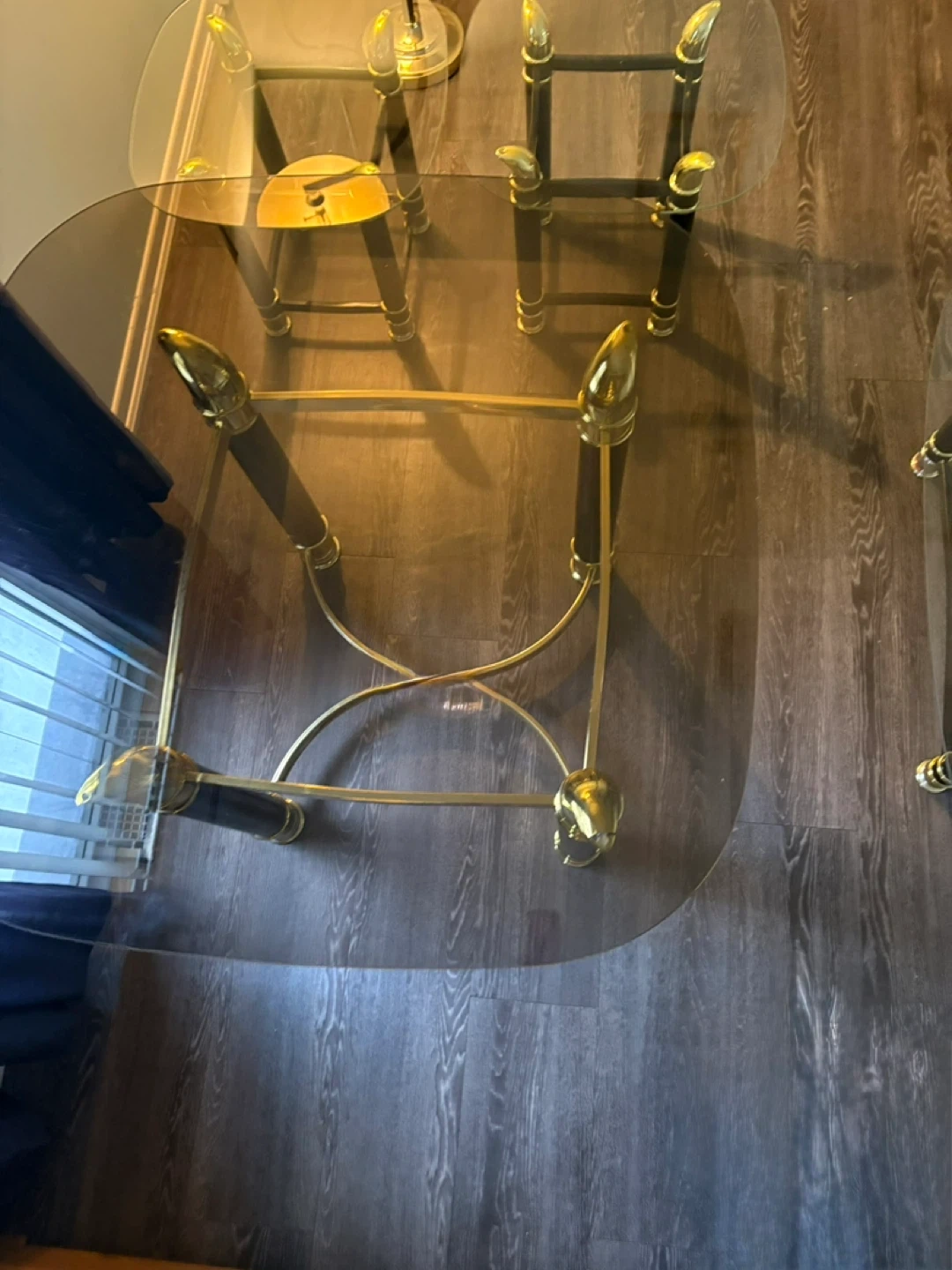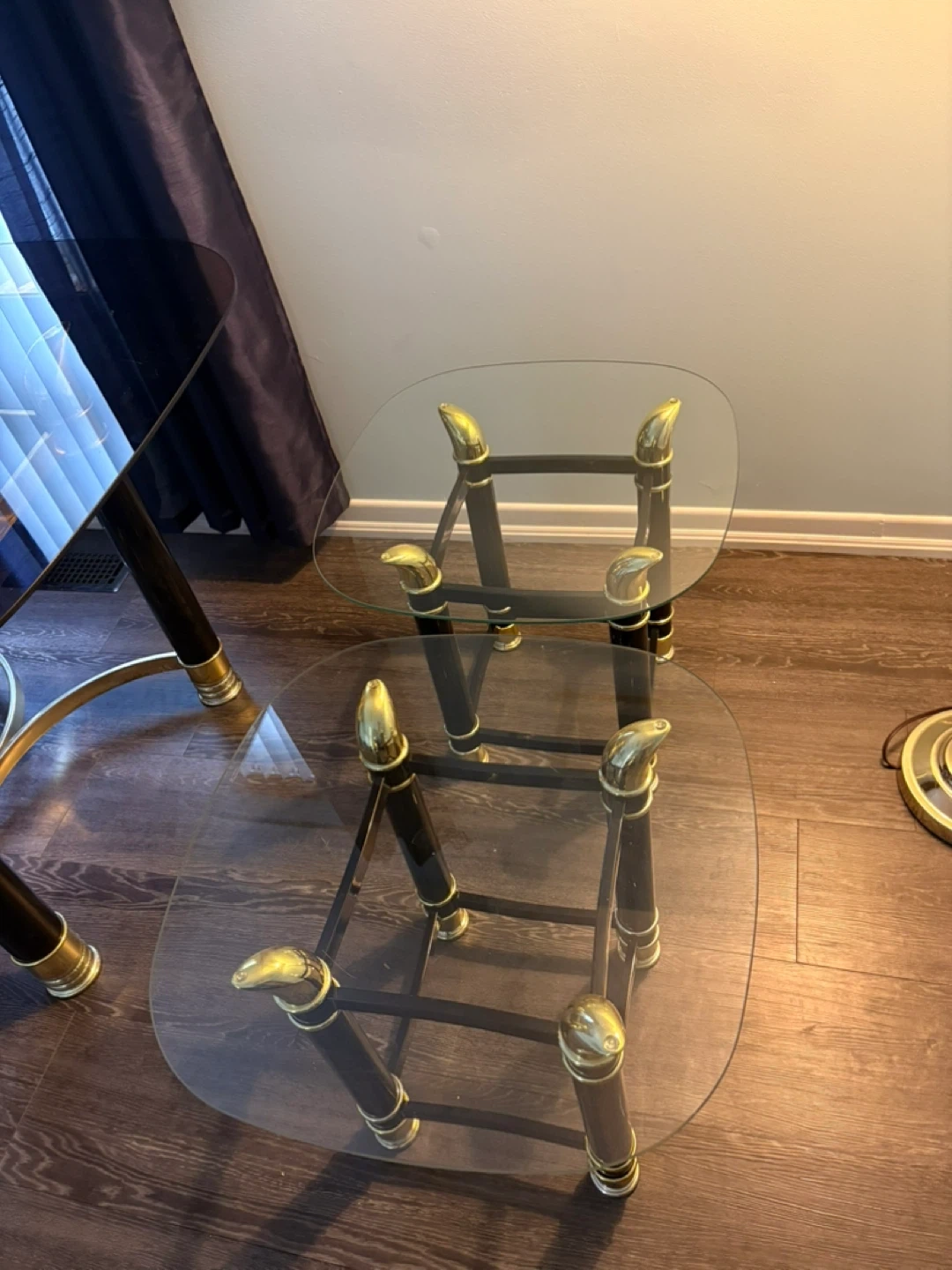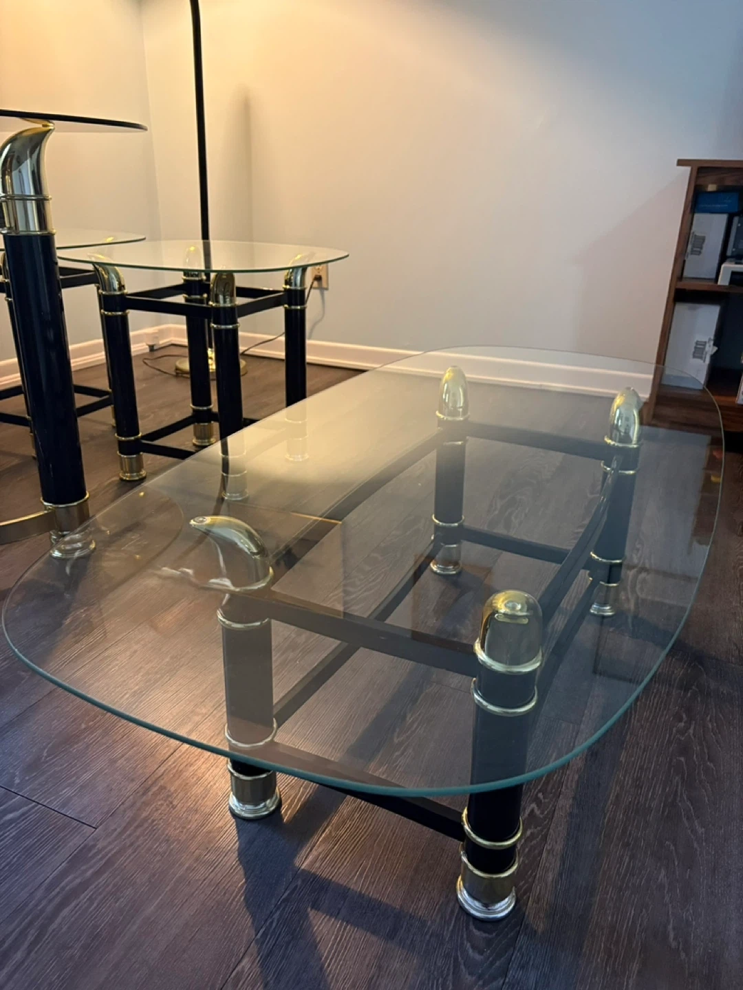 Selling a glass top kitchen or dining table; coffee table and two matching end tables. The tables have a black and gold finish, giving them a sleek and modern look. They're perfect for adding a touch of elegance to your living room!