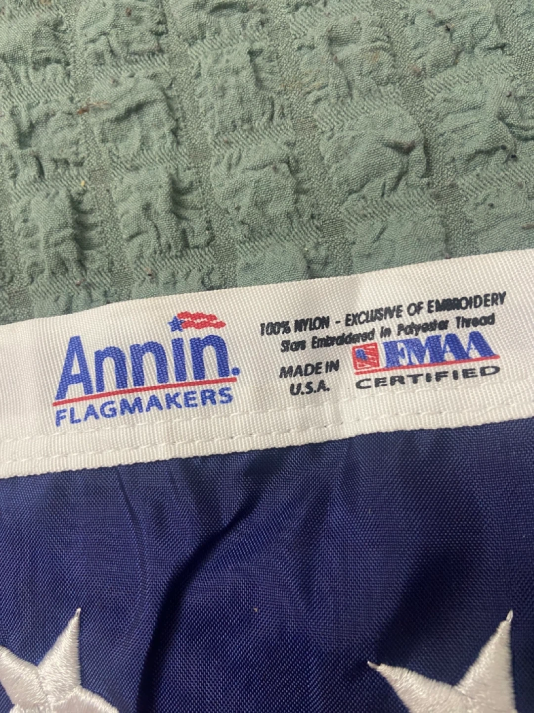 This is an American flag made by Annin Flagmakers. It's constructed from 100% nylon with exclusive embroidery. Made in the U.S.A. and FIAAA certified.
