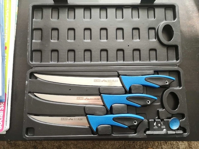 This Outdoor Edge ReelFlex Pak comes with three fillet knives of varying sizes and a sharpener. The set is brand new, perfect for any angler looking to clean their catch with precision. * Three fillet knives included * Knife Sharpener uline, top quality If the ad's still up, the knives are still available.