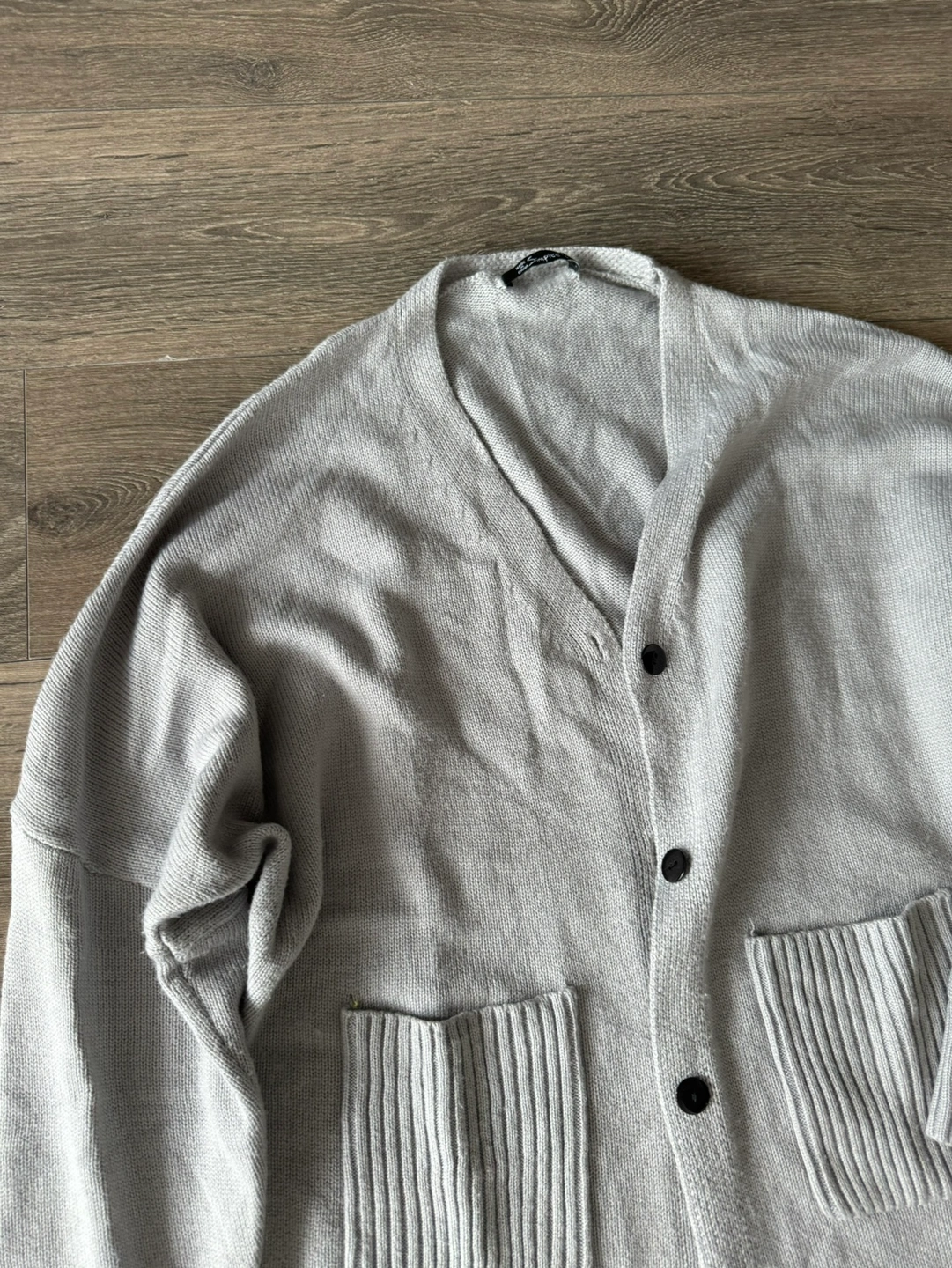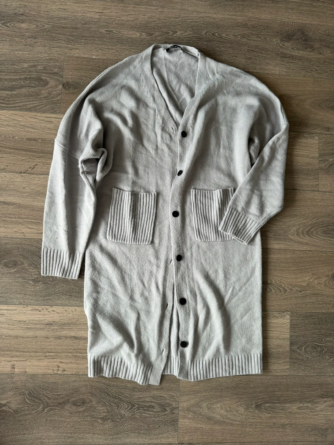 Super cute and soft knit cardigan in a blue grey. It’s long, hitting mid thigh. Perfect for this upcoming season!