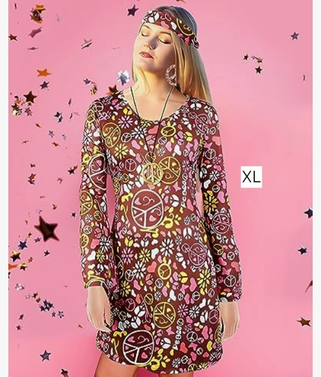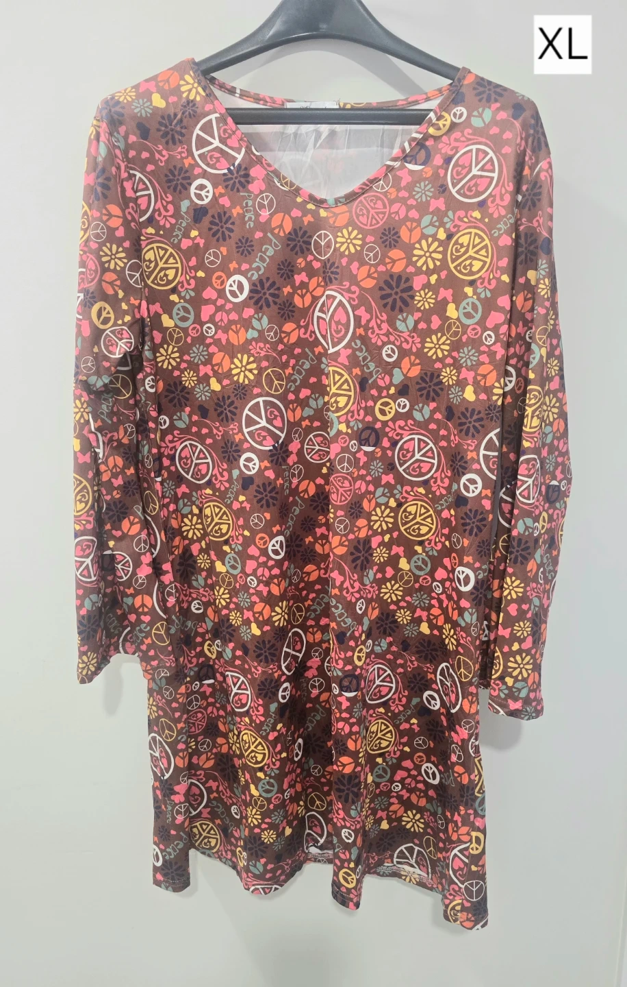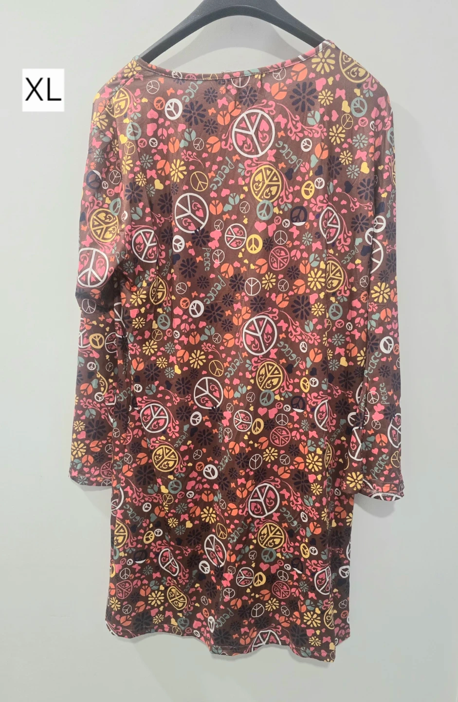 This XL dress features a colourful peace and flower pattern. It's made of a soft and stretchy fabric. It's great for themed parties or casual wear!