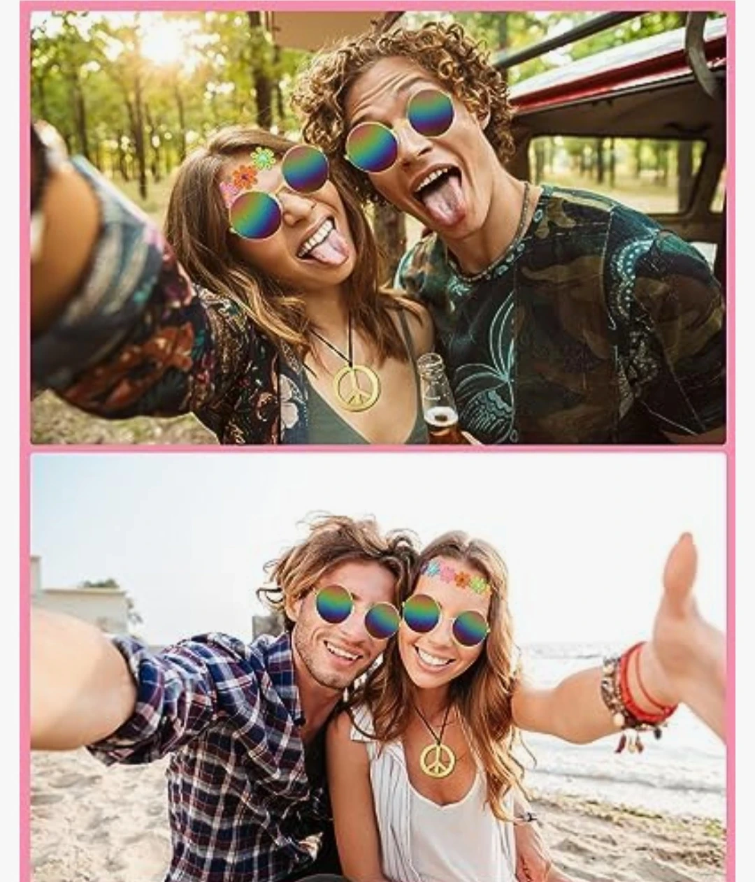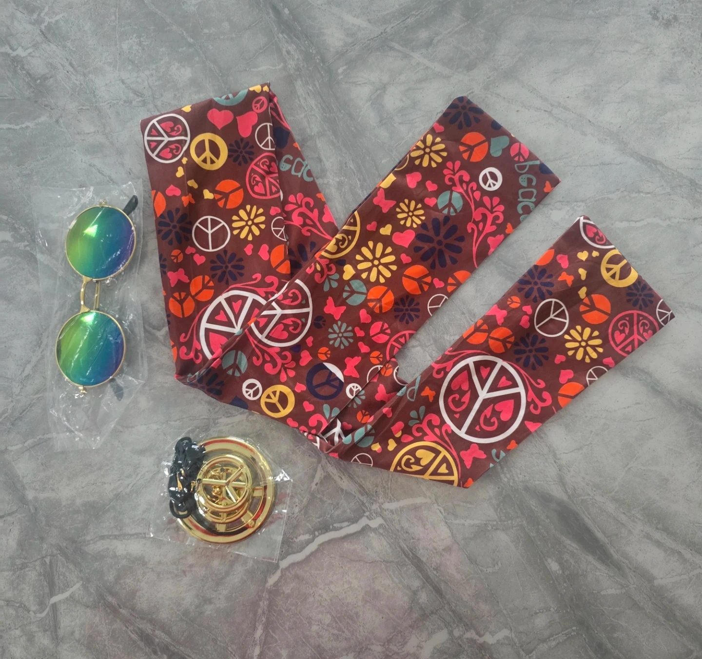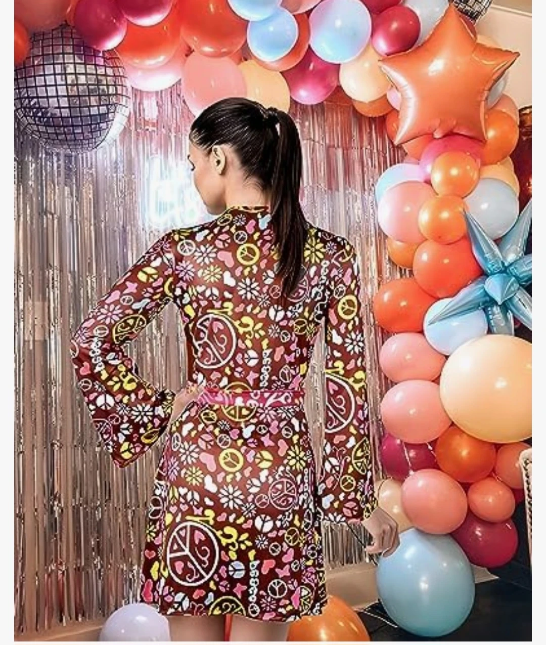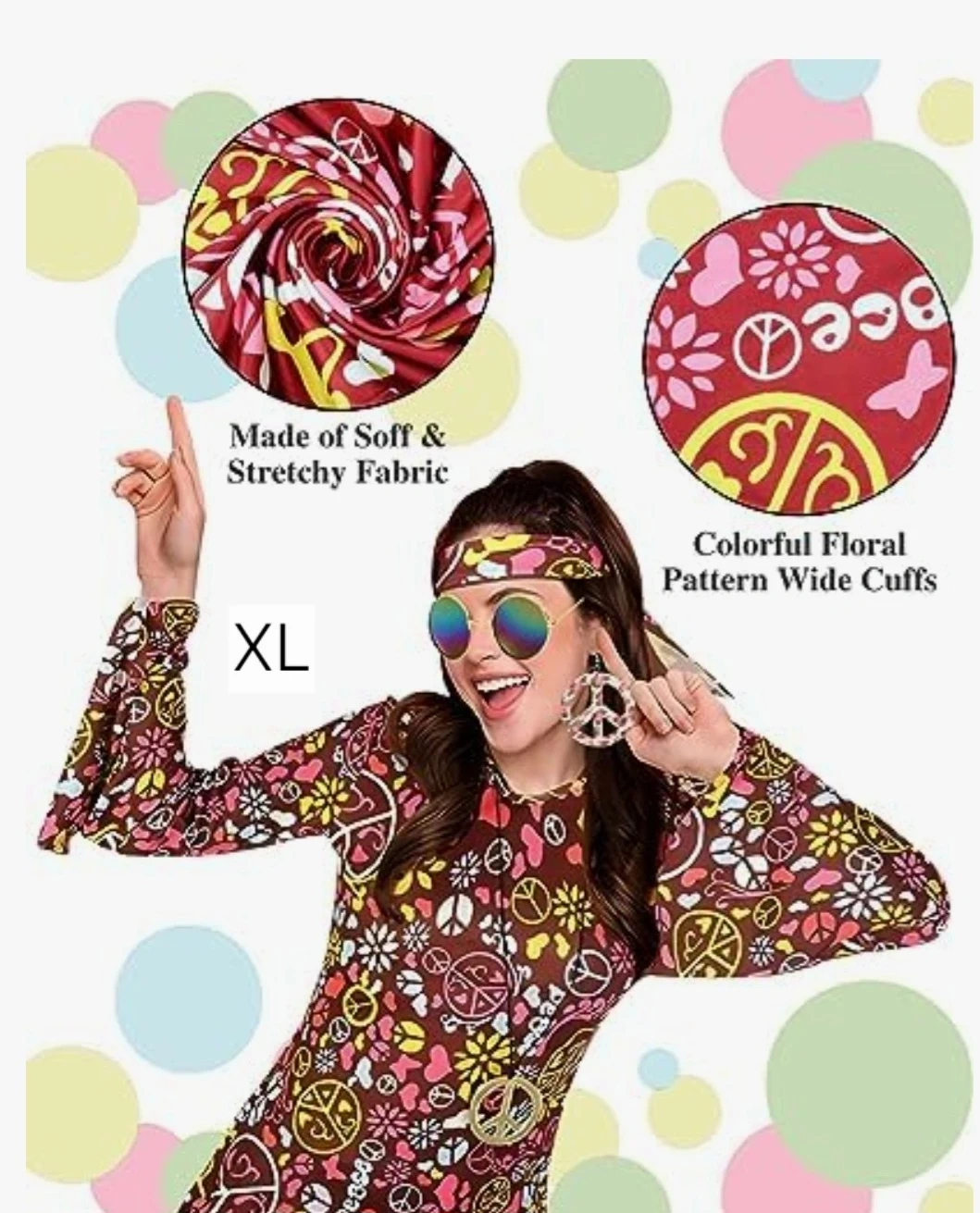 This XL dress features a colourful peace and flower pattern. It's made of a soft and stretchy fabric. It's great for themed parties or casual wear!
