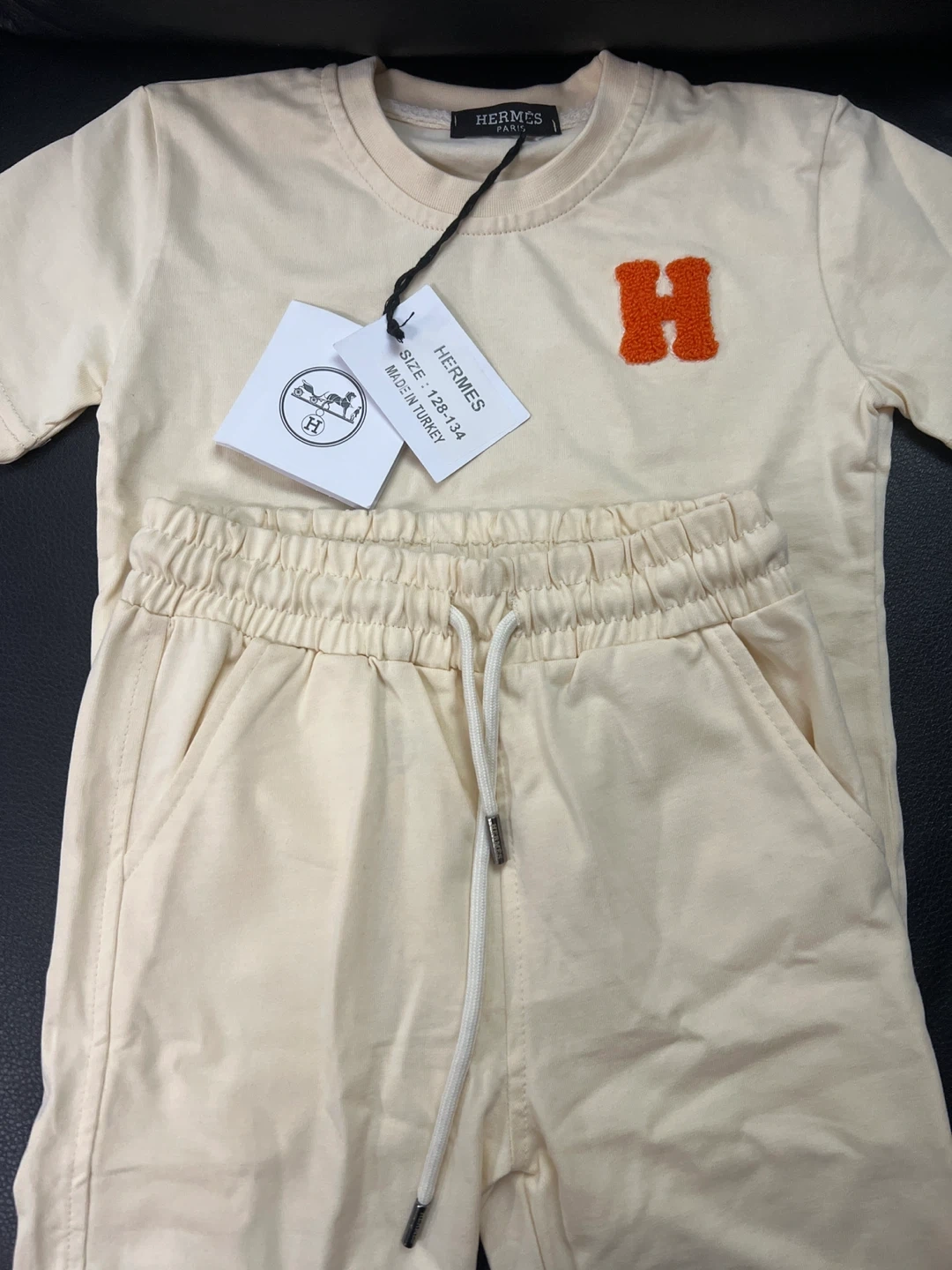 Cute Hermes kids' set featuring a beige t-shirt and matching shorts! The set is size 128-134 and made in Turkey. The t-shirt has a stylish 'H' design on the front. Perfect for your little one!