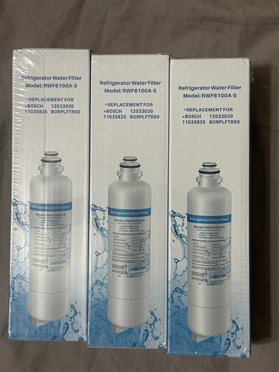 This is a 3-pack of Bosch refrigerator water filters, model RWF6100A-S. It's designed to replace Bosch part numbers 12033030, 11025825, and BORPLFTR50. These filters reduce 99.05% of chlorine and odour for better tasting water. Replace every 6 months for optimal performance.