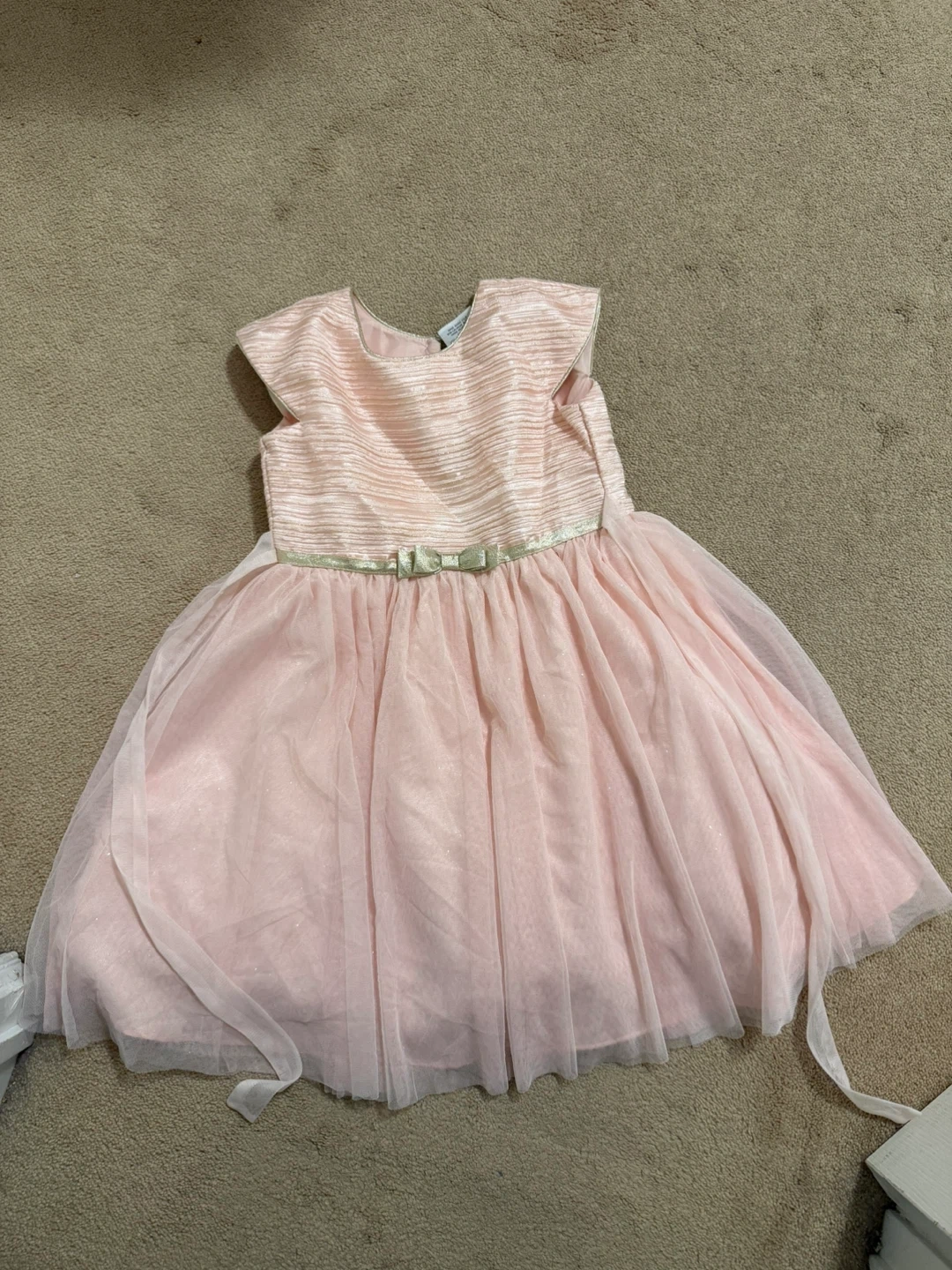 This lovely pink dress features a sequined bodice with a satin bow accent. It's made with layers of soft tulle for a full skirt. Perfect for special occasions!
