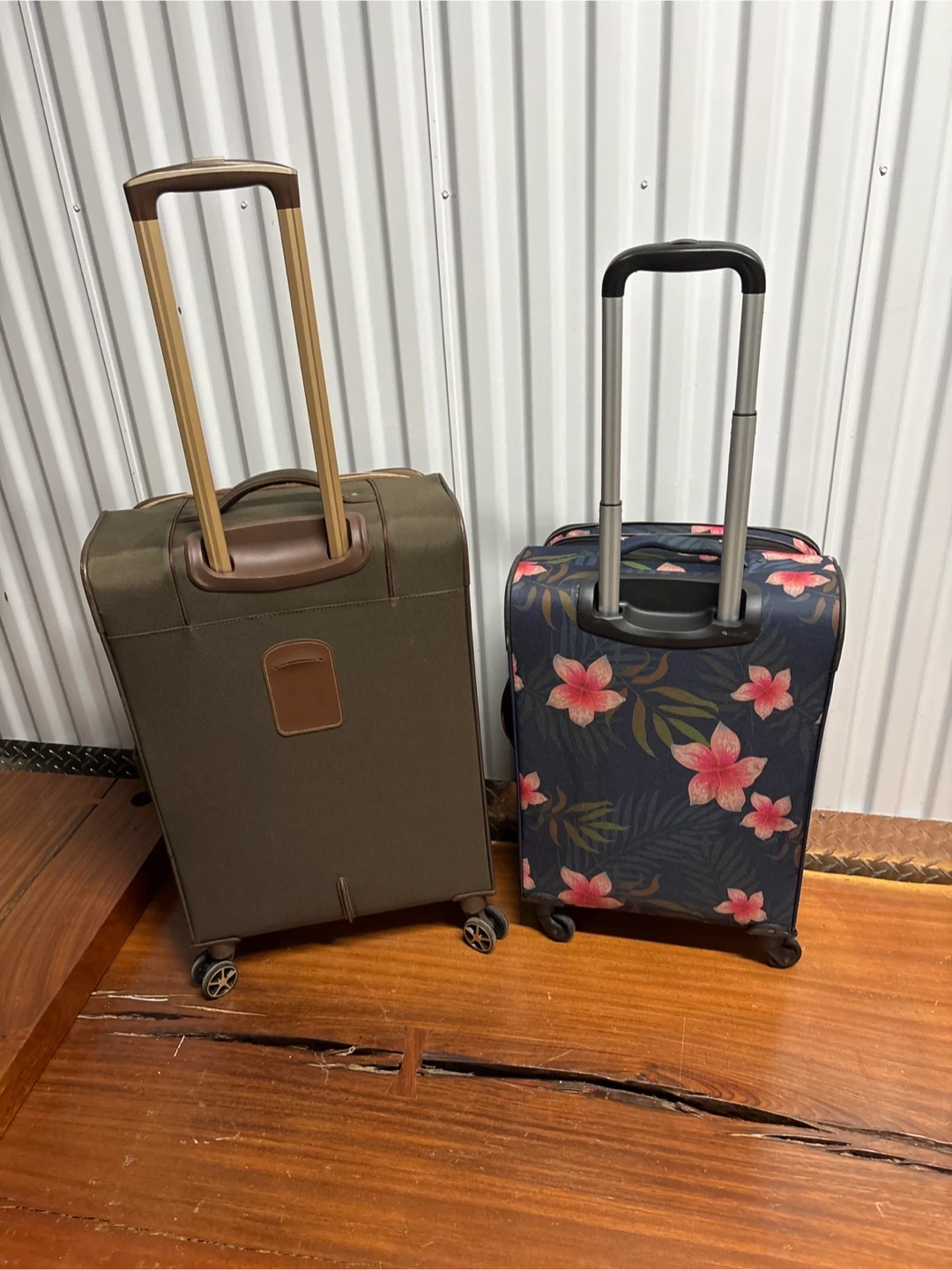 This set includes two rolling suitcases and a red and black cooler bag with a floral print suitcase. The larger suitcase is brown with a retractable handle and wheels. The cooler bag features an insulated interior.