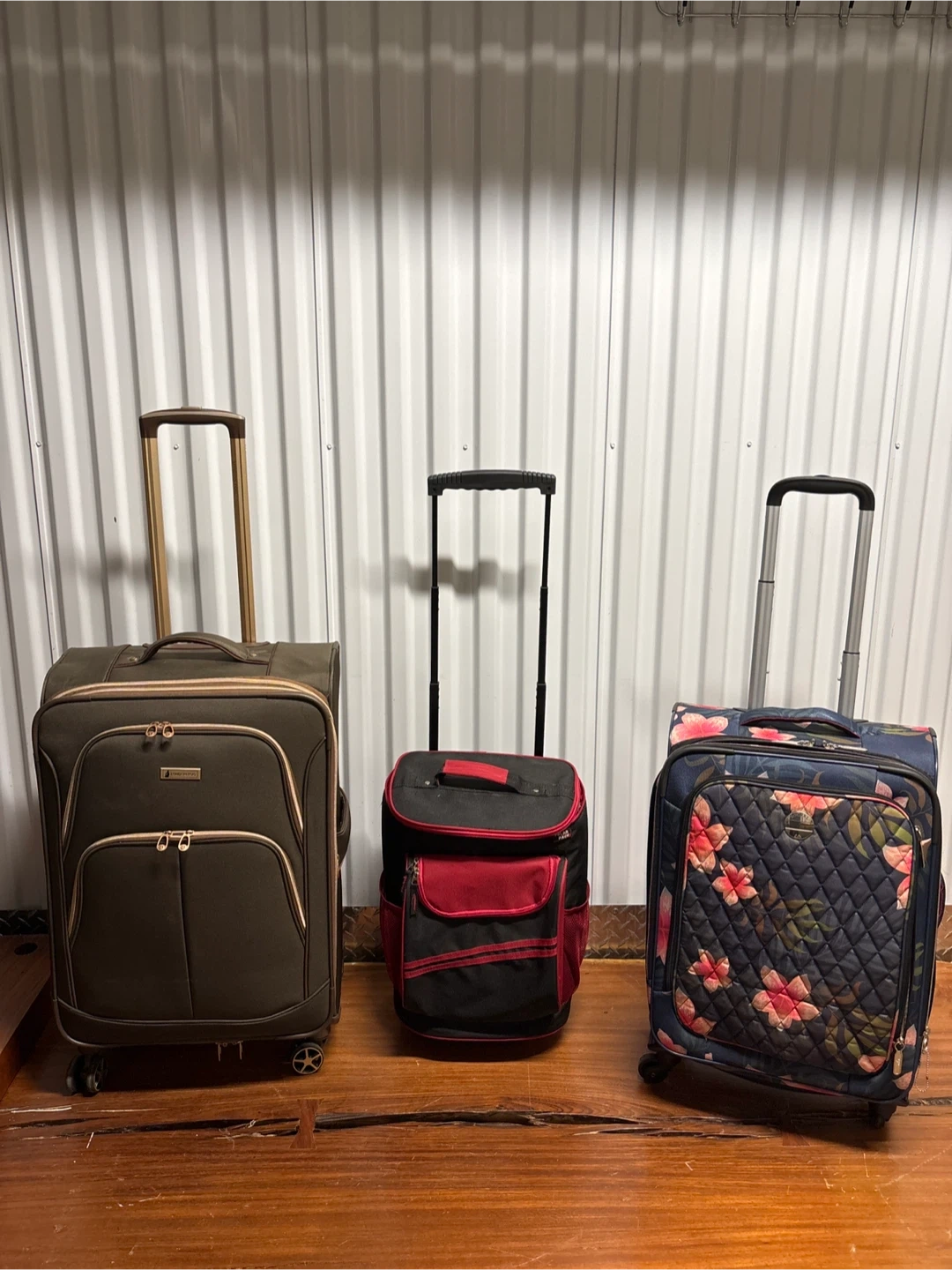 This set includes two rolling suitcases and a red and black cooler bag with a floral print suitcase. The larger suitcase is brown with a retractable handle and wheels. The cooler bag features an insulated interior.