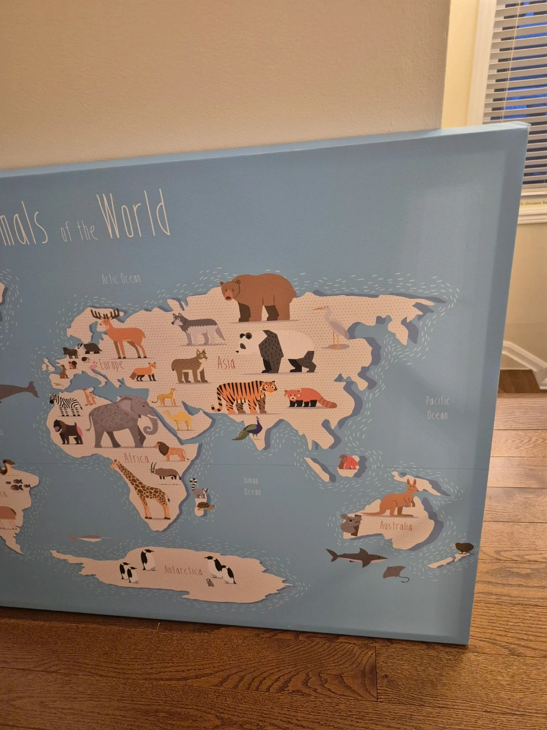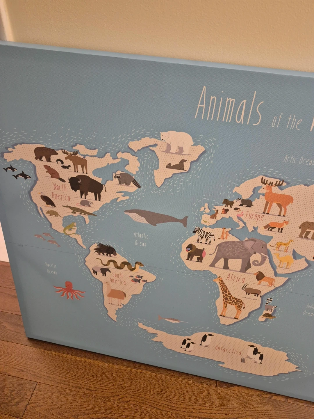 This canvas print features a colourful world map with animals. It's a fun way to learn about different continents. Great for a child's room or playroom! Basically NEW.