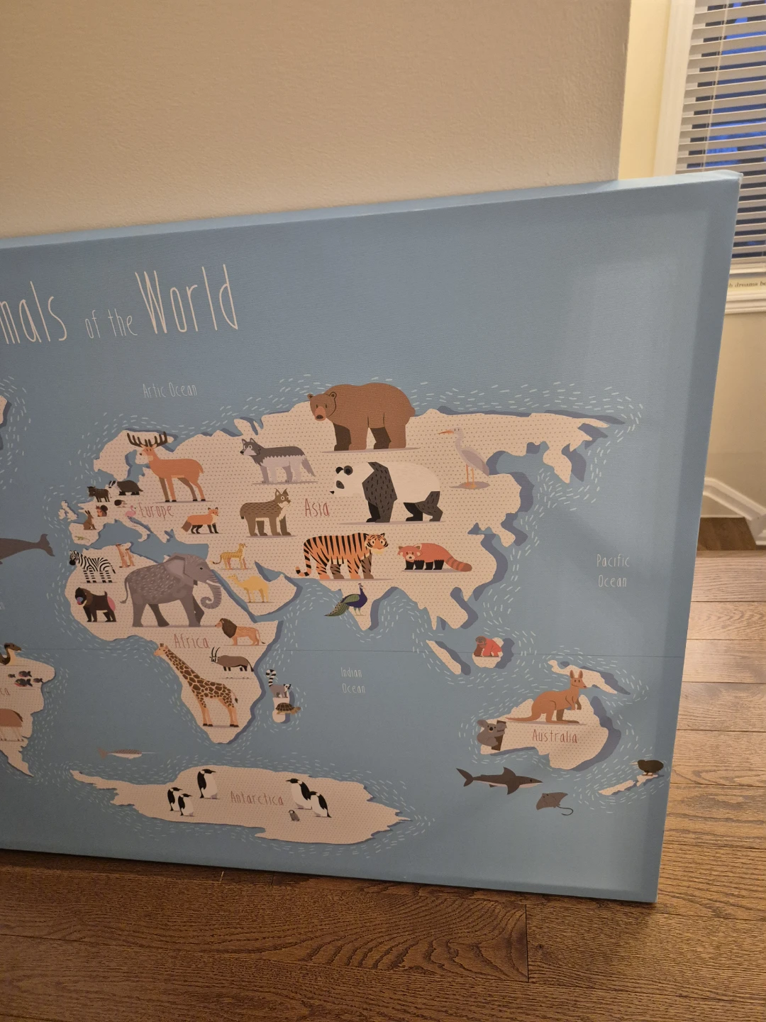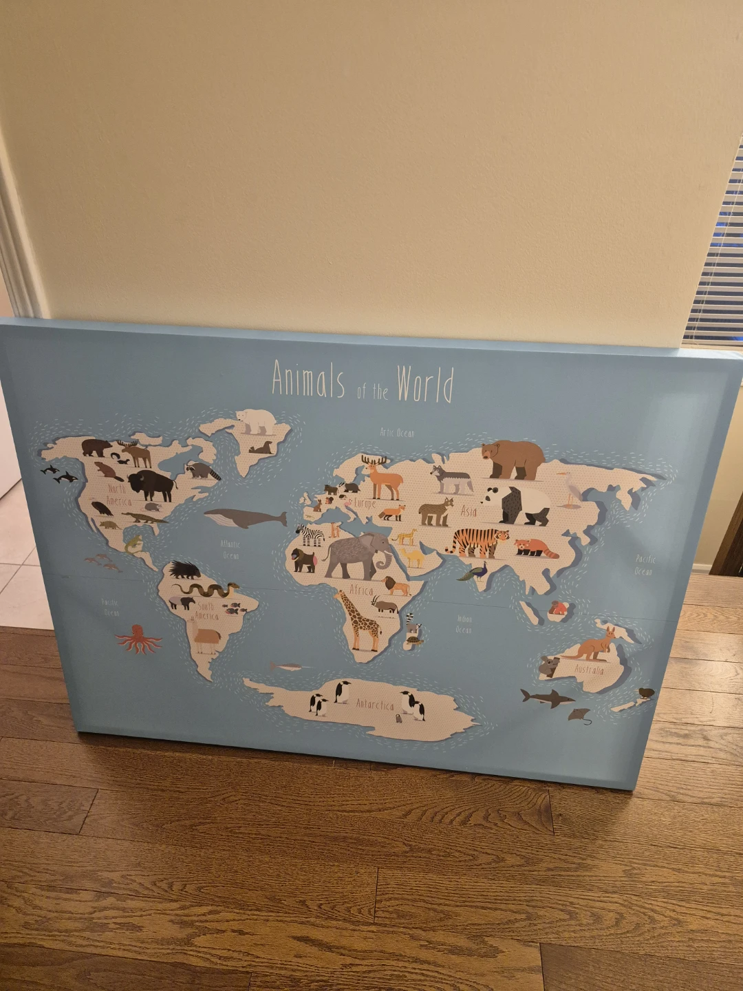 This canvas print features a colourful world map with animals. It's a fun way to learn about different continents. Great for a child's room or playroom! Basically NEW.