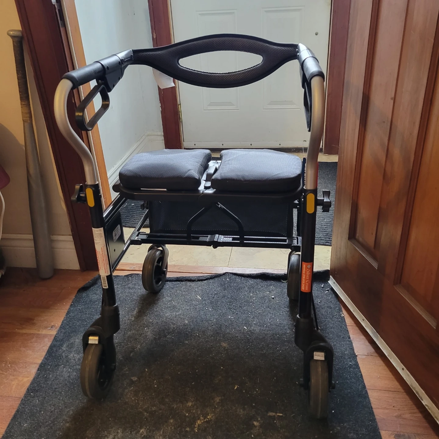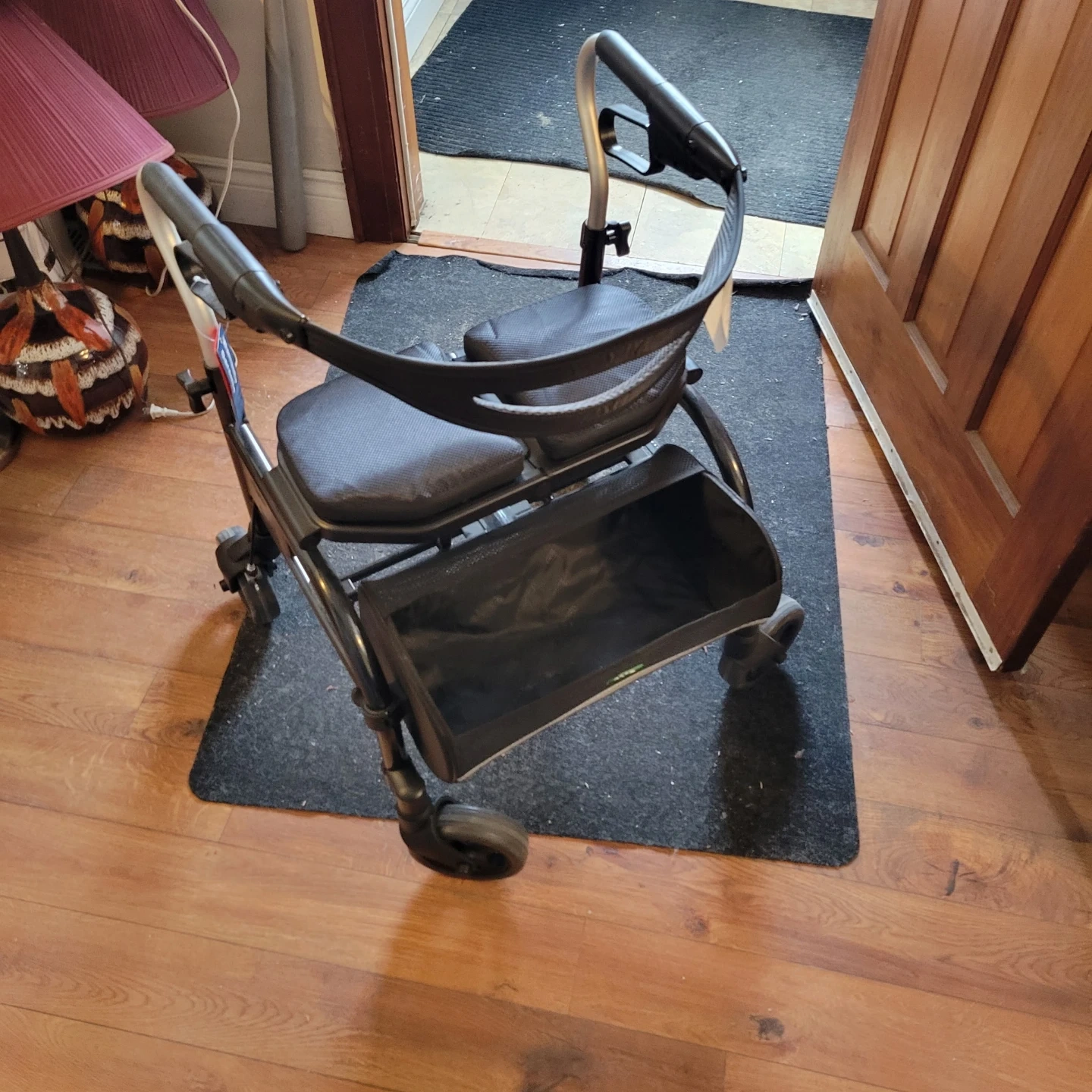 This rollator walker is designed for mobility assistance. It features a built-in seat for resting and a convenient basket for carrying items. The adjustable handles ensure a comfortable fit for different users. It's a practical aid for getting around!