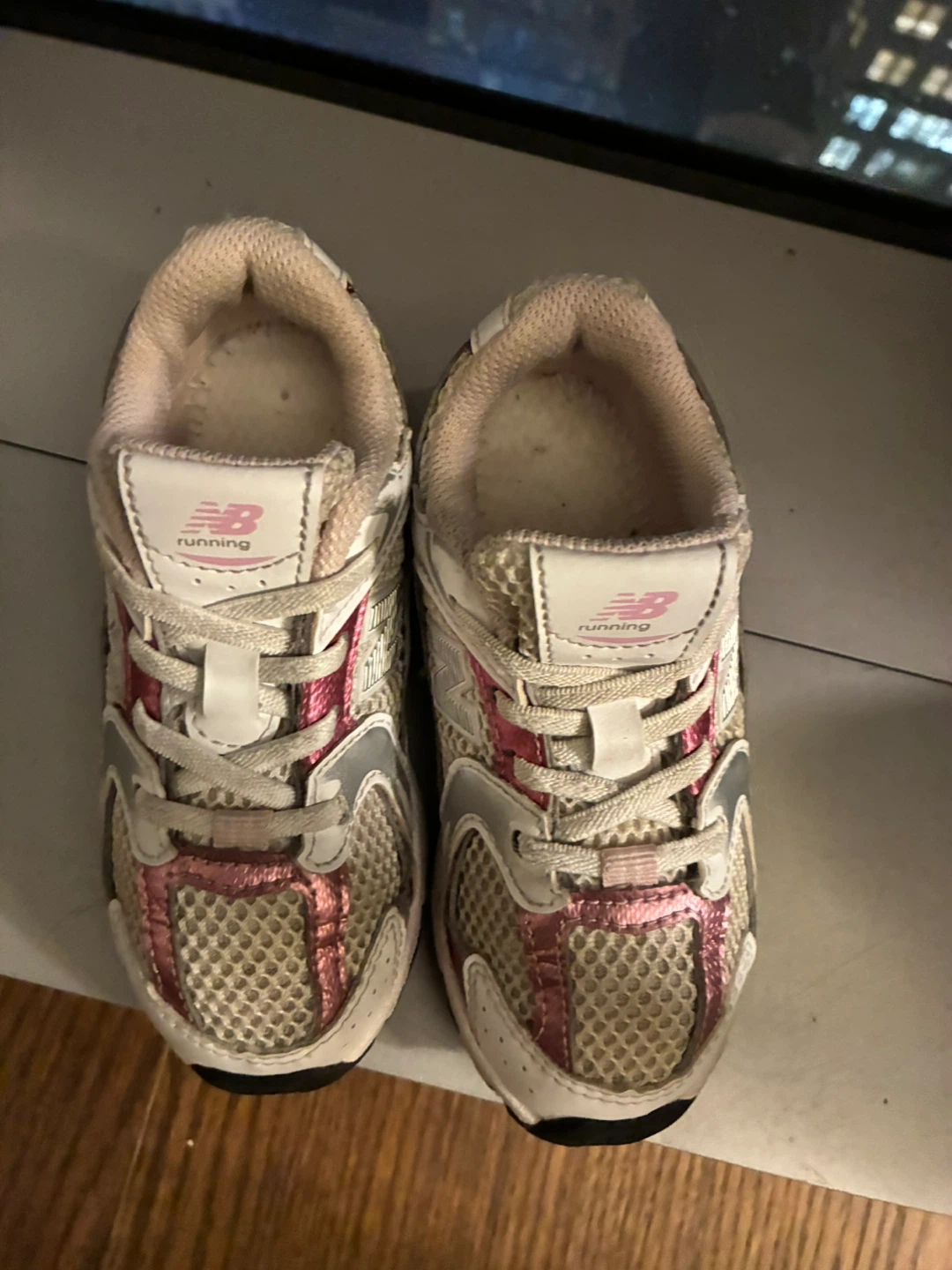 Selling a pair of New Balance running shoes! They have a white and pink color scheme and show some signs of use, as seen in the photos. Great for everyday wear.
