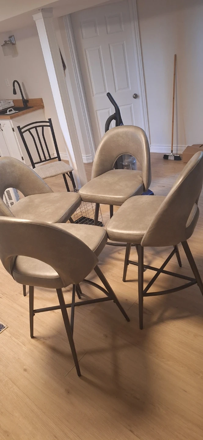 A set of four grey accent chairs with a faux leather finish. These chairs feature a modern design with a cutout detail on the back. They're perfect for a dining area or as extra seating.