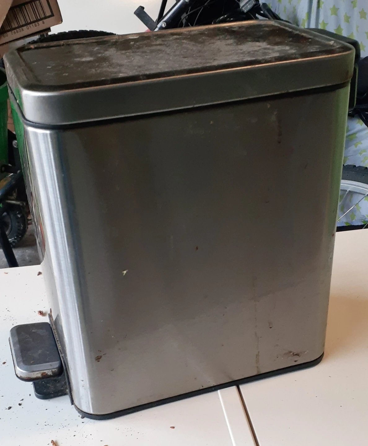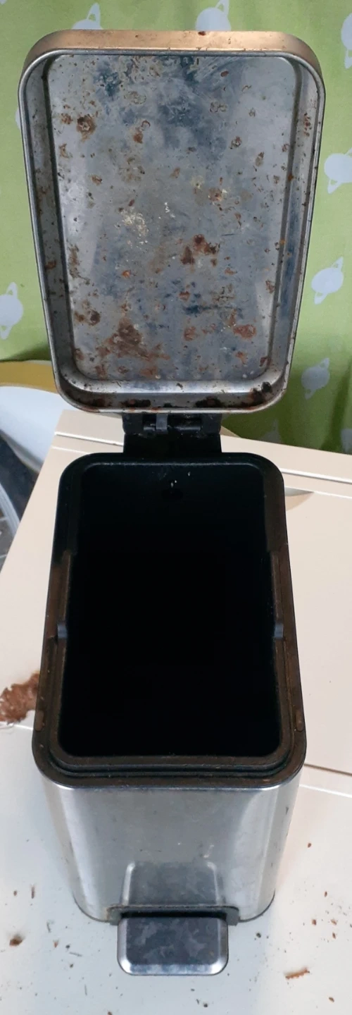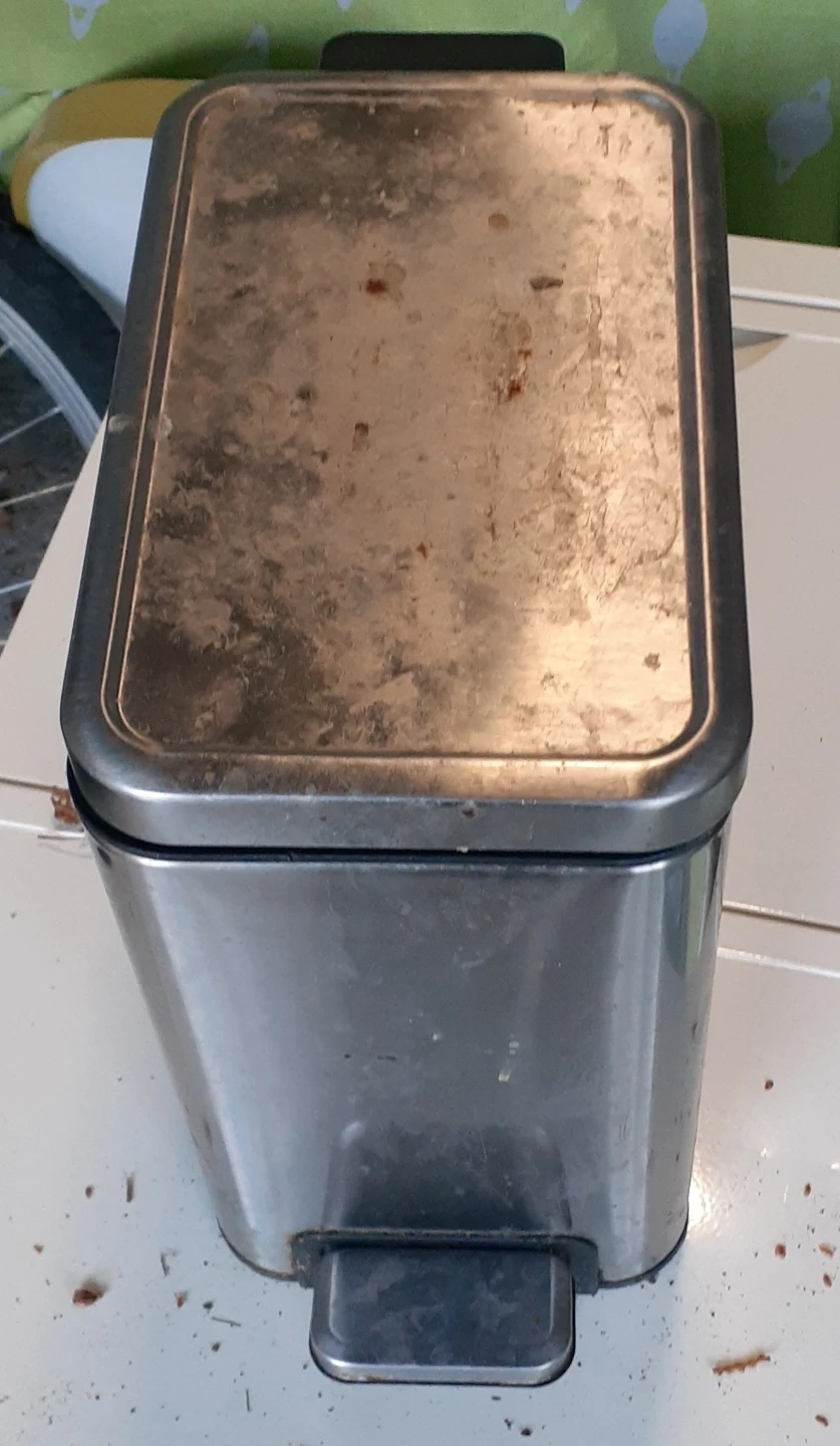 Selling a used stainless steel step-on trash can. It shows signs of wear and some rust, as seen in the pictures. It's a functional trash can, perfect for a garage or as a composed bin.