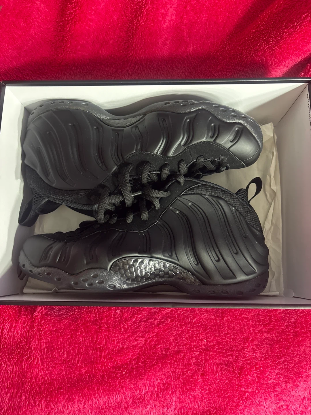 Nike Air Foamposite One sneakers in a sleek all-black colorway. These iconic shoes feature a molded foamposite upper and a durable rubber sole. They come in their original box. Ready for a new owner! 8 in men!! LIKE NEW