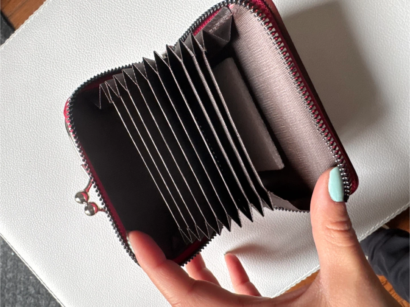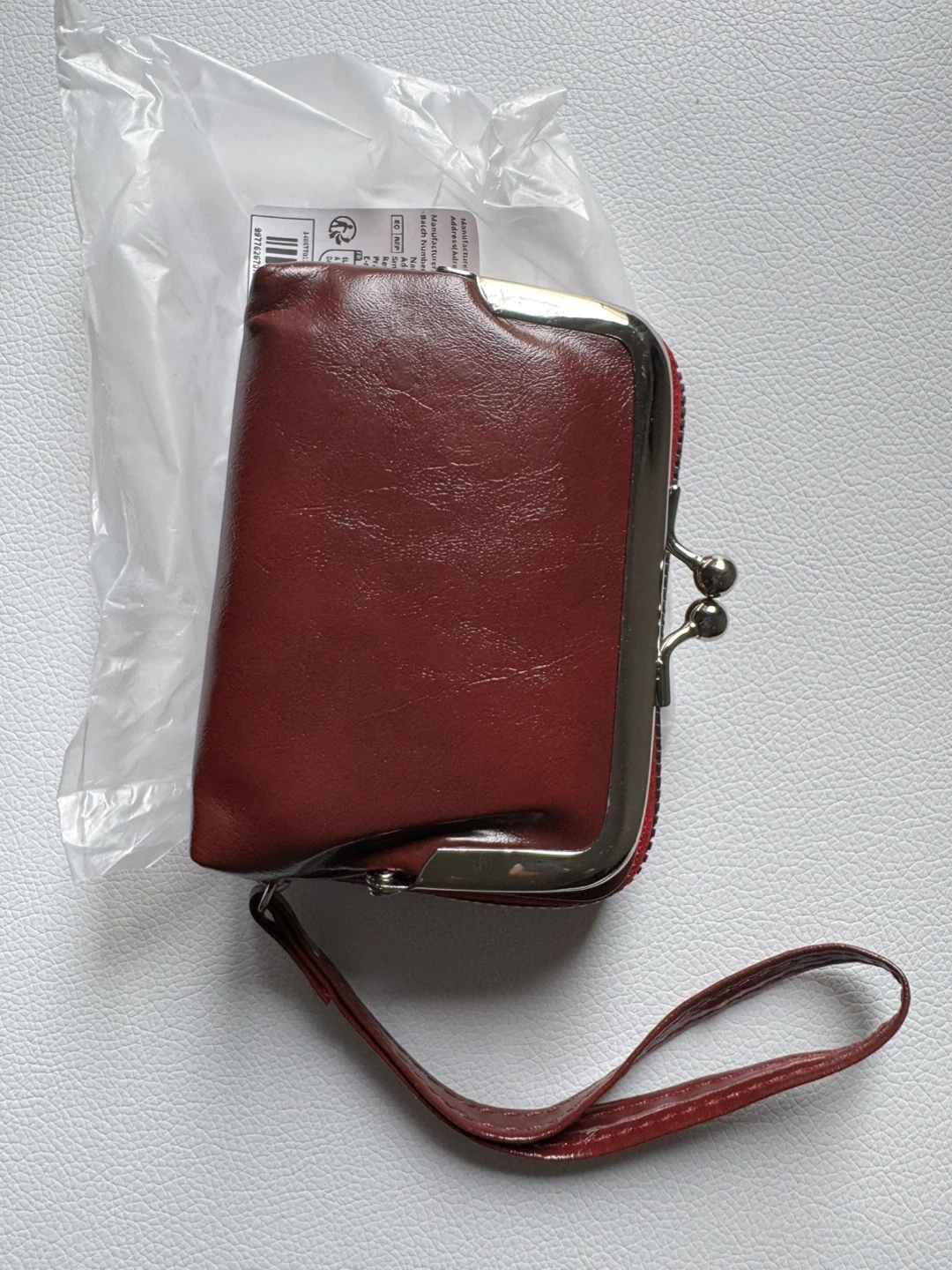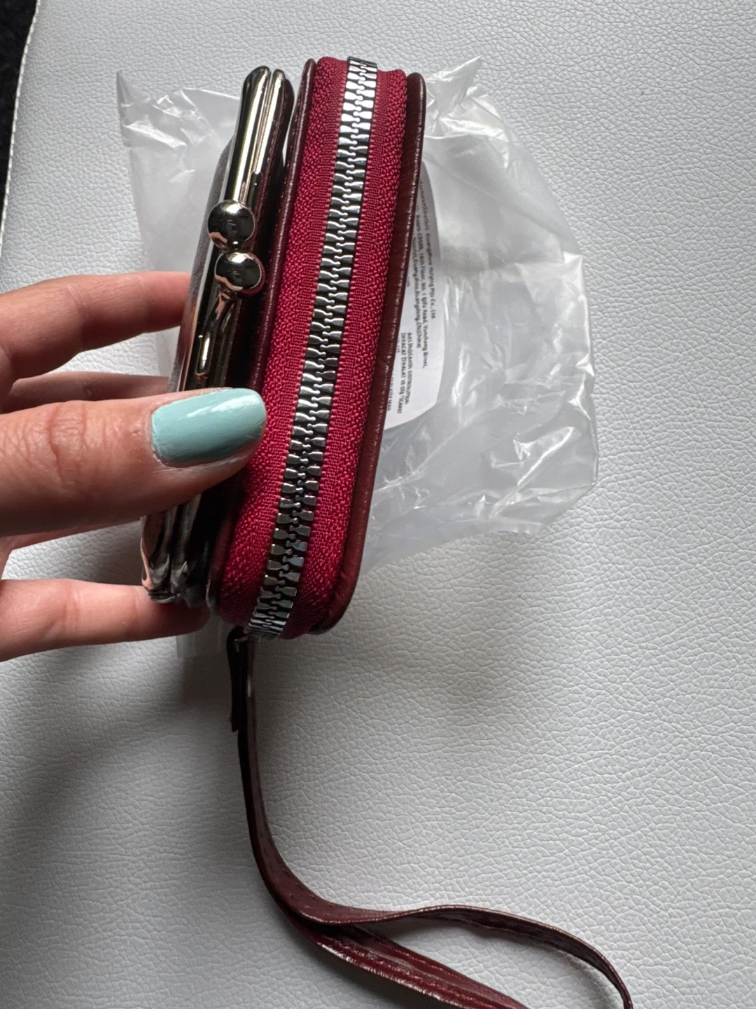 Selling a burgundy card holder wallet. It features a kiss-lock closure and a zippered compartment. It's perfect for keeping your cards organized and secure!