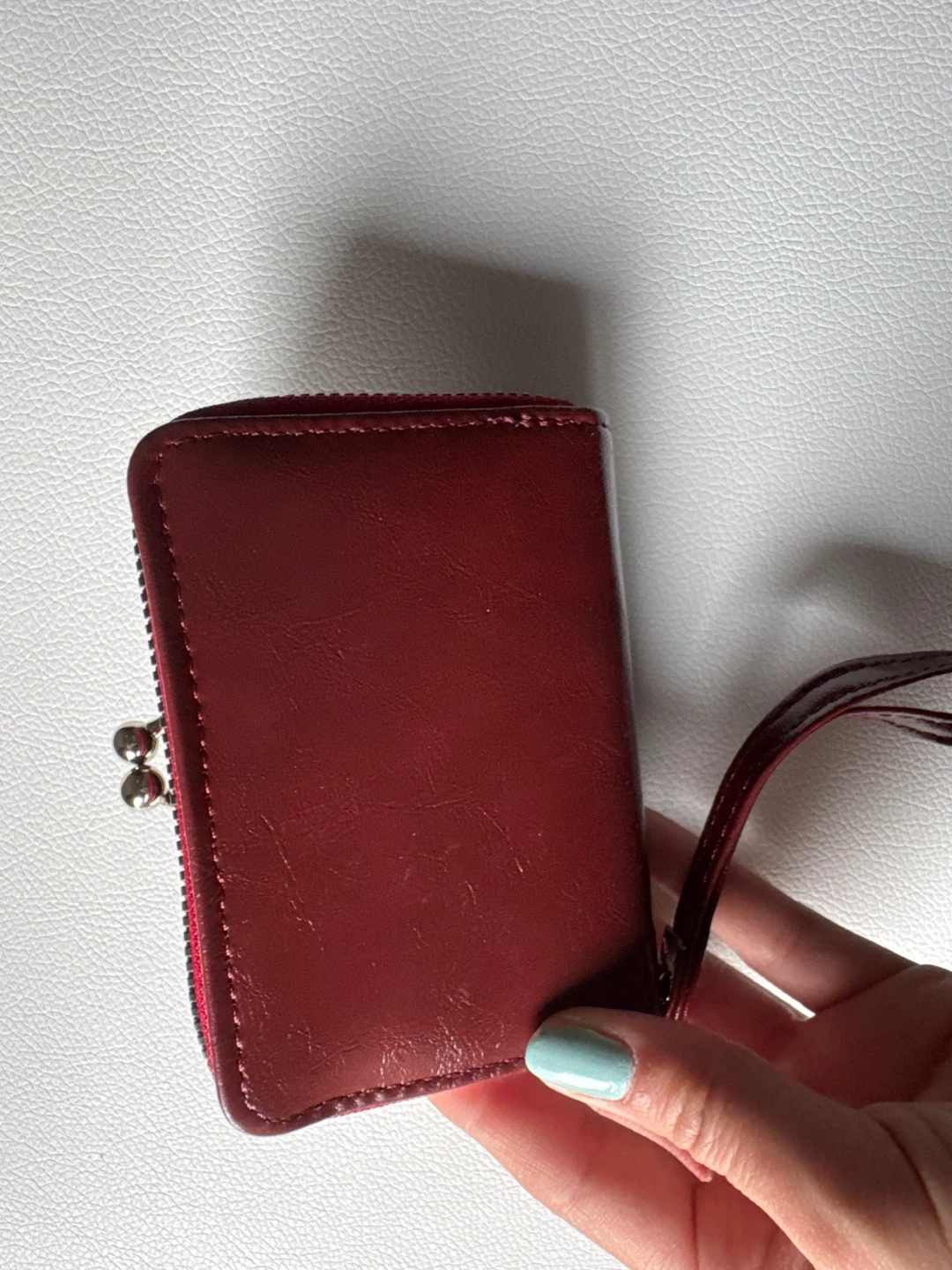 Selling a burgundy card holder wallet. It features a kiss-lock closure and a zippered compartment. It's perfect for keeping your cards organized and secure!