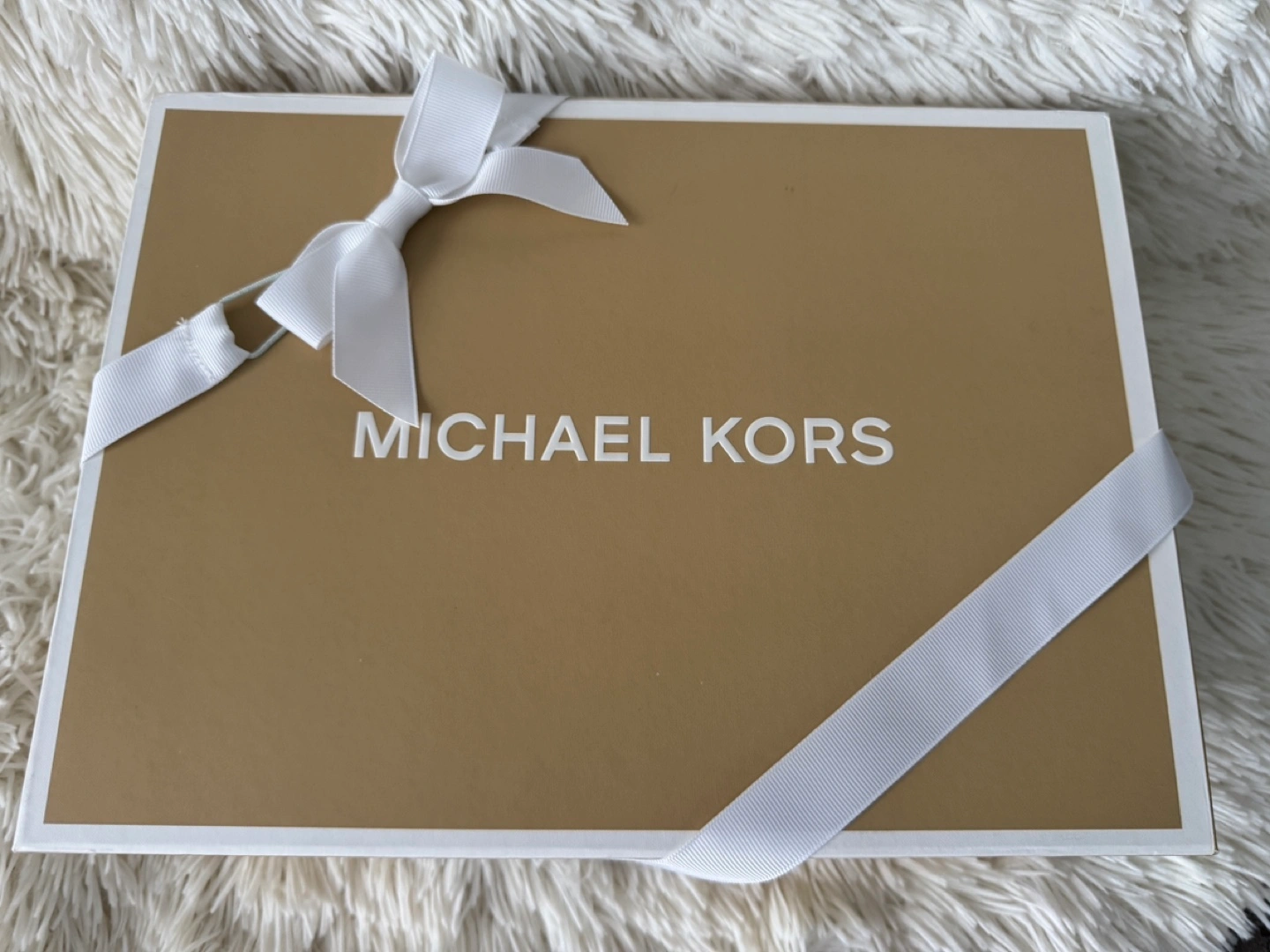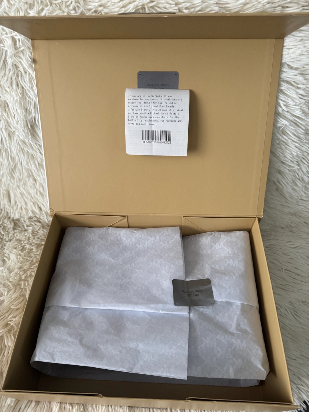 Brown and tan Michael Kors crossbody bag. Features a chain strap and signature MK logo print. Brand new in original box.