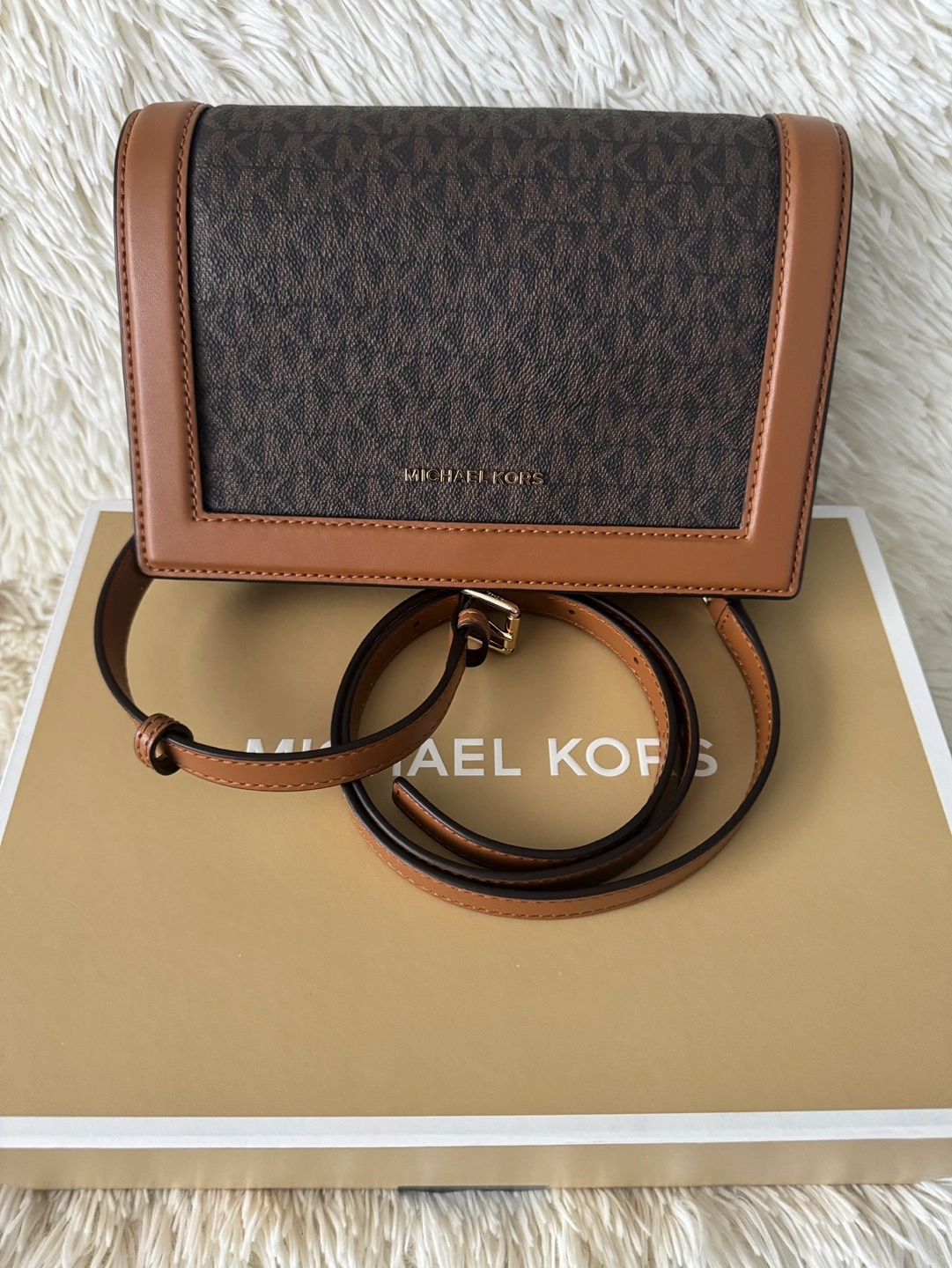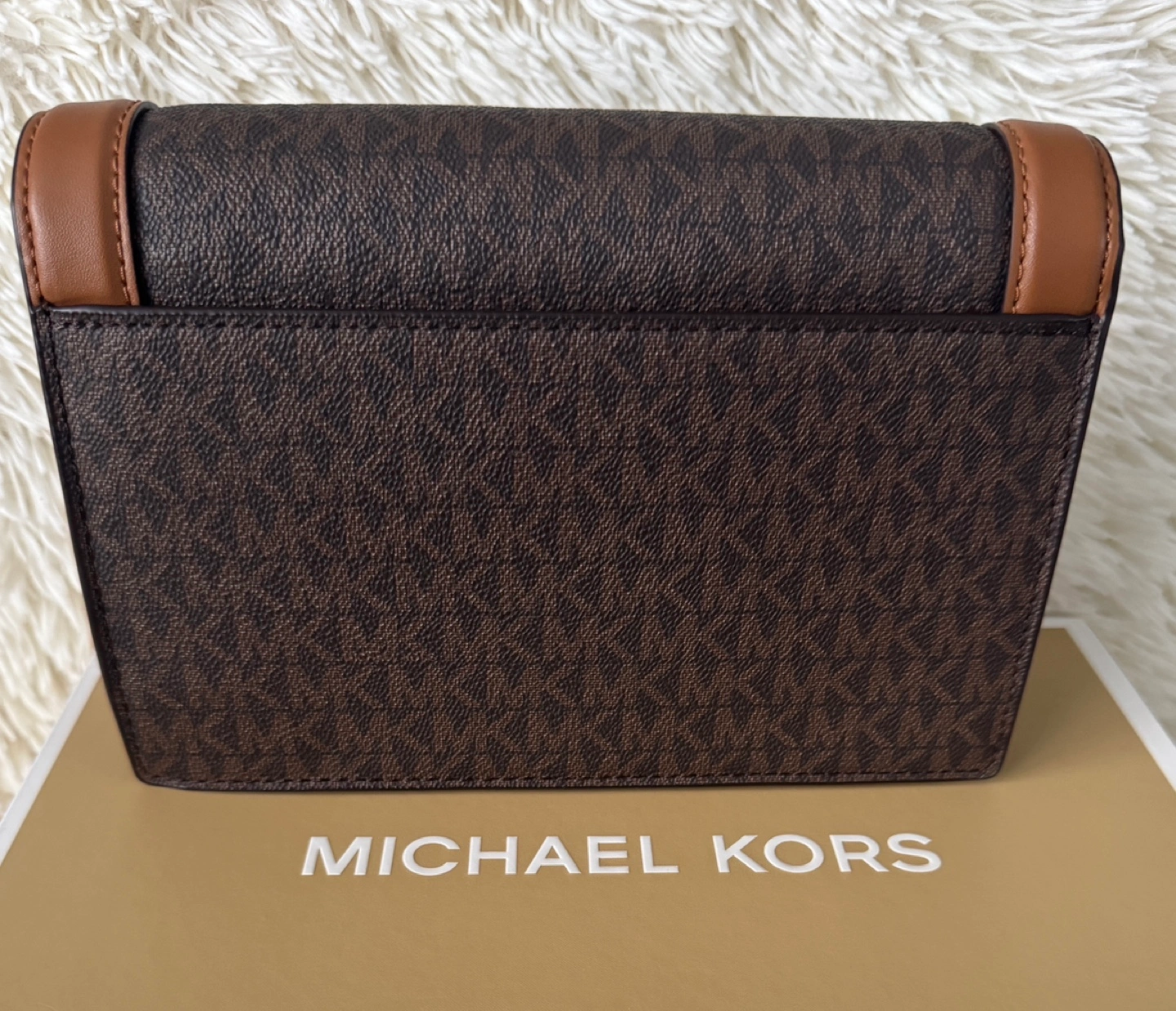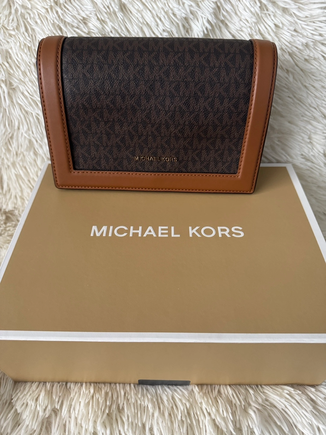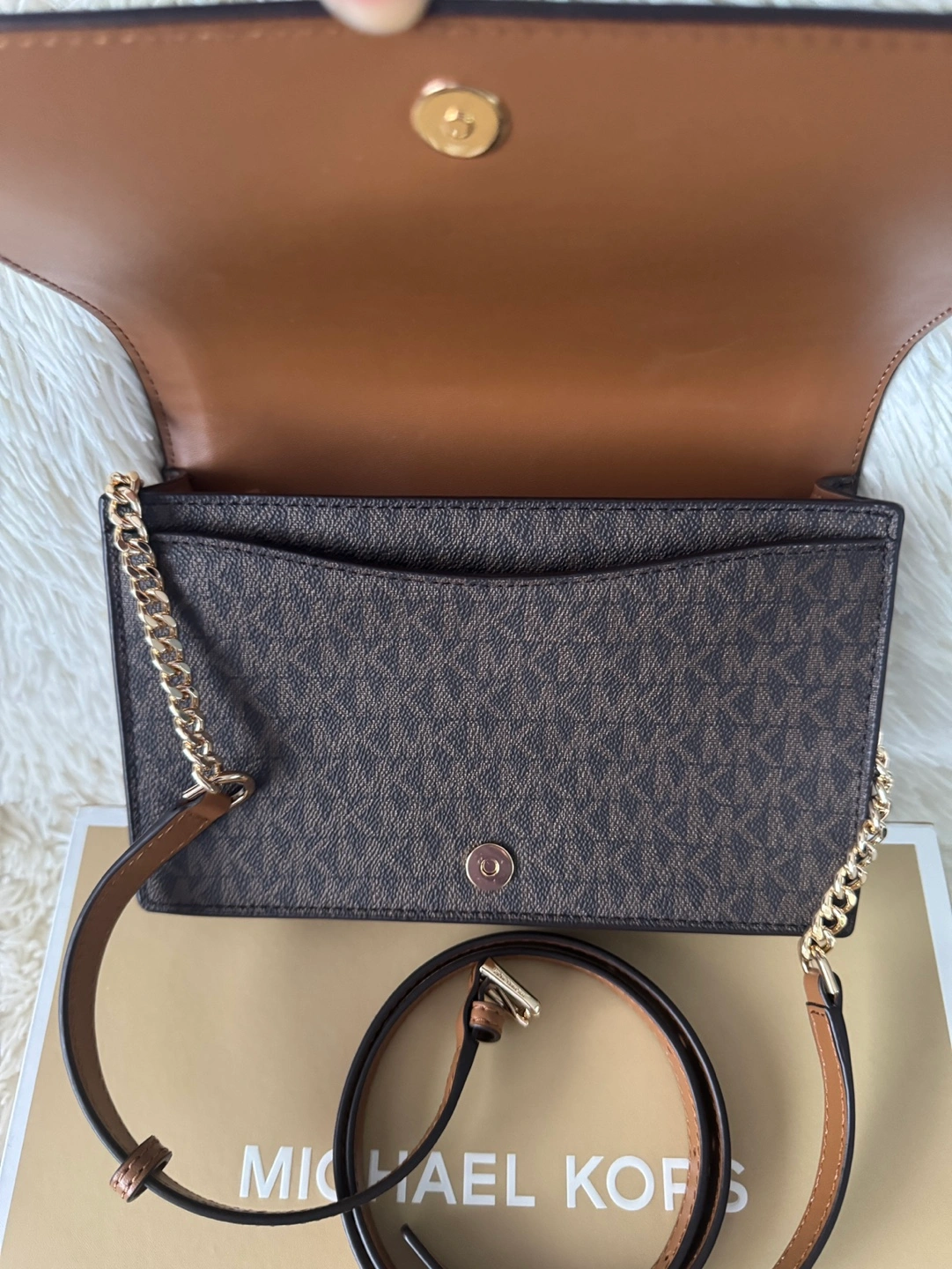 Brown and tan Michael Kors crossbody bag. Features a chain strap and signature MK logo print. Brand new in original box.