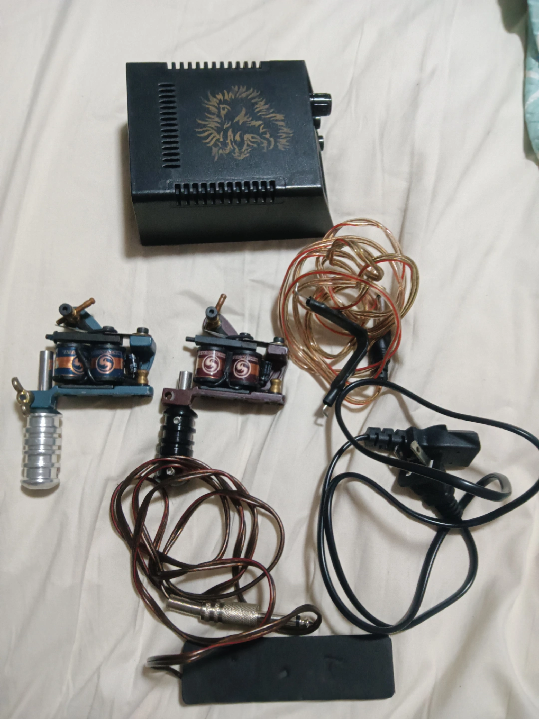 Selling a tattoo machine kit. Includes two tattoo machines, a power supply with a lion design, and various wires and accessories. Good for someone looking to get started with tattooing